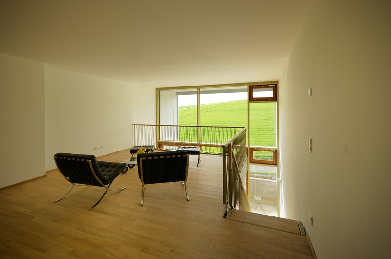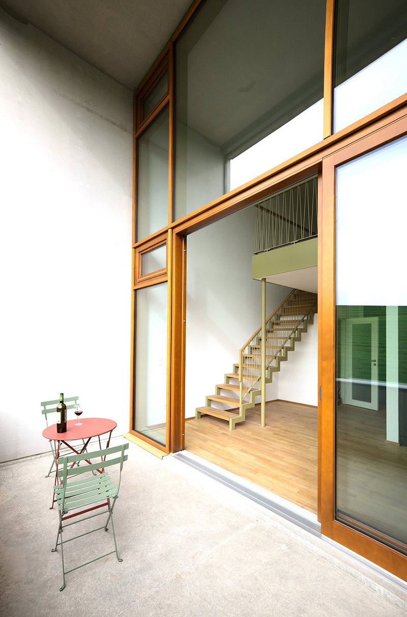 InnenraumgestaltungEs sind 2- und 3- Zimmer-Wohnungen in unterschiedlicher Größe entstanden. Die außerordentliche Wohnqualität wird durch vollverglaste Flächen auf West- und Ostseite erreicht, an denen die Wohn-/ Schlafräume und Bäder angeordnet sind. Dies bietet sehr viel Tageslicht in günstiger Ost-Westorientierung. Durch die Galerien der Maisonettewohnungen sind die Glasflächen zum Teil zweigeschossig. Lichtdurchflutete Räume garantieren ein komfortables Wohnerlebnis und bieten einen Ausblick in die unverbaute Landschaft auf der Westseite. Jede Wohnung verfügt über mindestens zwei Loggien, jeweils auf Ost- und Westseite. Des Weiteren ist jeder Wohnung ein kleiner privater Gartenanteil zugewiesen.