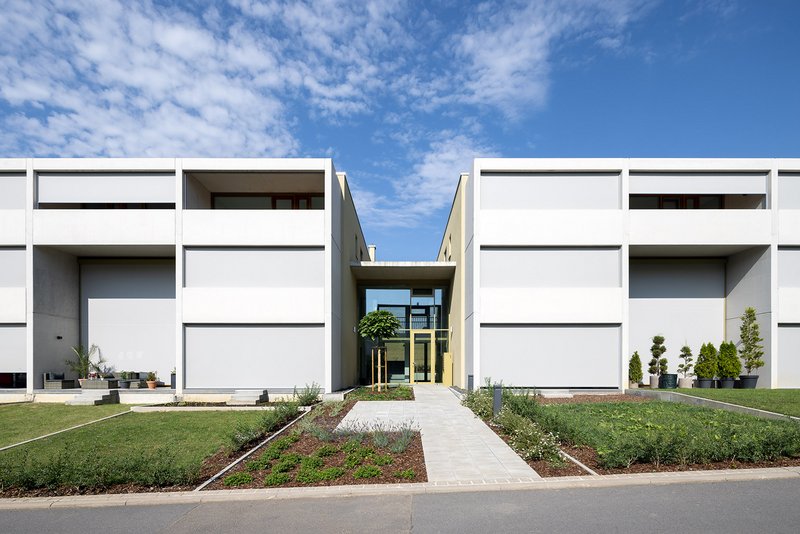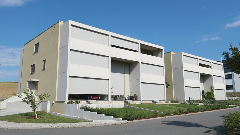Äußere GestaltDie beiden Wohnkuben sind kompakt gehalten mit von den Baukörpern entkoppelten Balkonen und dazu passenden Sonnenschutzelementen als sogenannte Zip-Screens, welche die Sicht nach draußen auch bei geschlossenem Sonnenschutz ermöglichen. Diese sind so angeordnet, dass auch eine Verschattung der Balkone ermöglicht wird, sodass die Aufenthaltsqualität auch bei starker Sonne auf den Balkonen vorhanden ist.