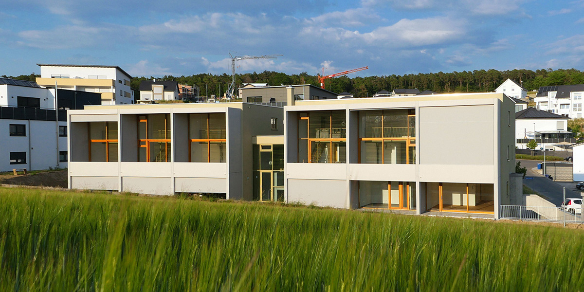 Städtebauliche und landschaftliche EinbindungDie beiden Wohnbaukörper sind mit einem Treppenhaus verbunden, welches sich unterordnet, damit die Kubatur geringer und gestaffelt ist. Des Weiteren ist das Treppenhaus komplett verglast und dadurch transparent. Auch Sicht- und Blickbeziehungen in die Landschaft werden so möglich. Als transparente Einheit erscheinen die beiden Mehrfamilienhäuser dadurch als Solitaire, dies reduziert optisch die Baumasse.