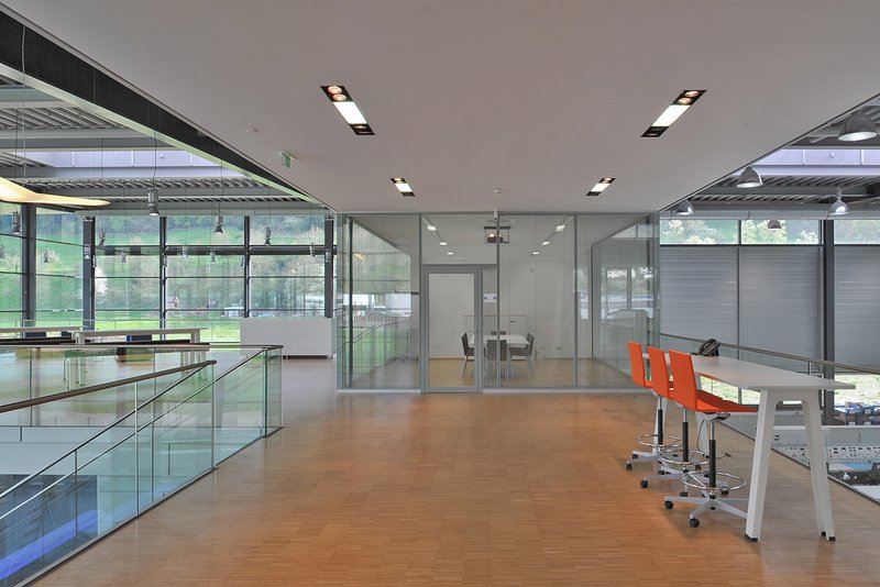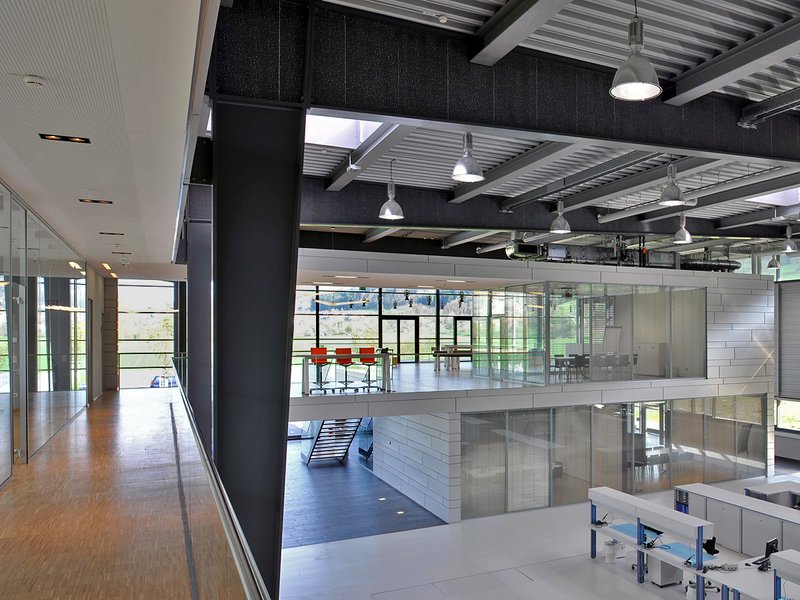 Die gemeinsame, trennungslose Unterbringung von Büro- und Fertigungsfächen in einem Raum stellt hohe Anforderungen an Klima und Akustik. Um die Offenheit nicht zu beeinträchtigen wurden zahlreiche Maßnahmen zu Luftkonditionierung und Schallschutz getroffen. Besonders empfindliche Zonen können mit profillosen Glasmembranen zusätzlich geschützt werden. Trotz hoher Glasanteile der Fassade ist der Energieverbrauch vor allem durch Nutzung von Grundwasserkälte für Prozess- und Raumkühlung sowie Einsatz hochwertiger Gläser und Dämmstoffe ausgesprochen niedrig. Beheizung und sommerliche Raumkühlung erfolgen durch Bauteilaktivierung. Dazu wird aus Brunnen Grundwasser gewonnen und nach thermischer Nutzung wieder in den Aquifer eingespeist. Die Elektro- und Medienversorgung der Arbeitsplätze liegt in abgesenkten Bodenkanälen mit flexiblen Entnahmemöglichkeiten.