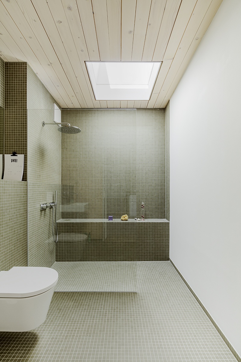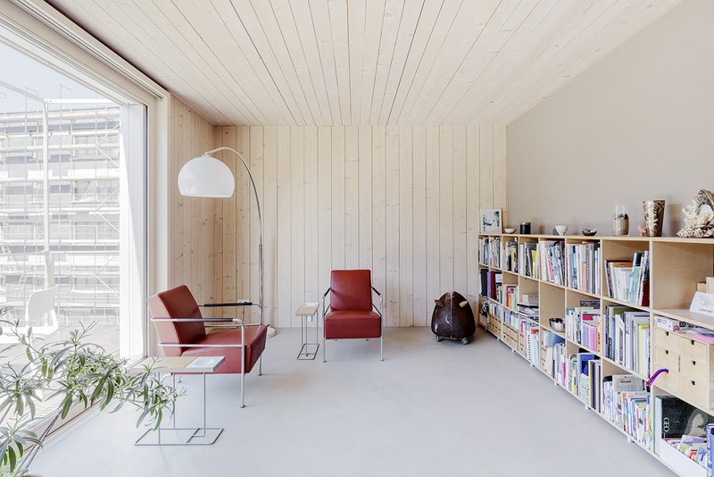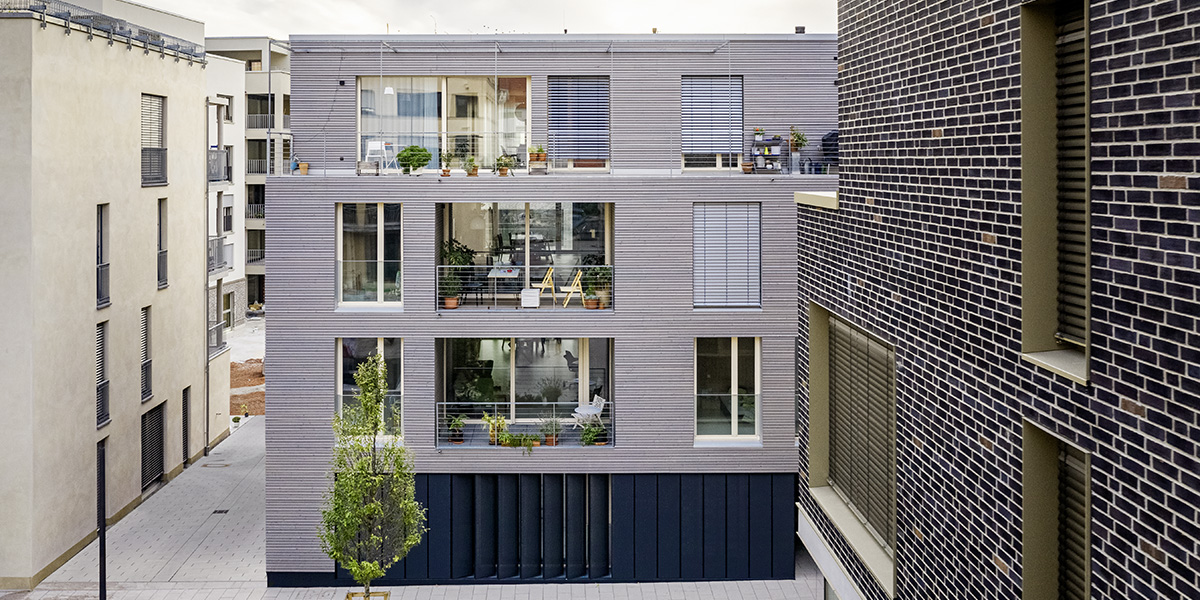 Architektonische QualitätDie grundrissliche Organisierung folgt einem klaren Konzept im Hinblick auf Flächenoptimierung. Die öffentliche Erschließung ist auf ein Minimum reduziert und lässt so eine maximale Ausnutzung des Baufelds zu Gunsten der Wohnfläche entstehen: Ein konsequentes Ausnutzen der verfügbaren städtischen Fläche um maximale Wohnqualitäten zu erzielen, flexible Grundrisse zum Anpassen an die jeweilige Lebenssituation und generationenübergreifendes und inklusives Wohnen (2 Wohnungen sind rollstuhlgerecht nach DIN). Durch effiziente und offene Grundrisse ohne Flure und Nebennutzflächen konnte von den Bauherren zusätzlich ein Gemeinschaftsbereich finanziert werden. Teile der Wohnung können je nach Anforderung an Lebensphasen hinzu- oder weggeschaltet werden: Hinzunahme einer Pflegekraft im eigenen Wohnbereich, Erweiterung bei Vergrößerung der Familie etc.Sämtliche Materialien sind in unbehandelten Sichtoberflächen gehalten. Das Treppenhaus ist durchgehend in Sichtbeton. Erst mit Betreten der Wohnungen wird die holzsichtige Tragkonstruktion erkennbar. Dies sorgt somit für einen spannungsreichen Kontrast zwischen privater Behaglichkeit und gemeinschaftlichen Nutzflächen. Teile der Fassade sind in schwarzem Streckmetall ausgeführt, um die gewünschte Privatheit im Erdgeschoss zu gewähren und um einen Kontrast zur homogenen silbernen Holzfassade zu erzielen. Die lasierten Holzfenster sind nach außen die einzige Anmutung, dass es sich um ein Holzhaus handelt. Dies ist bewusst gewählt, um sich materialtechnisch in das städtische Umfeld einzufügen.Die Fassade wurde ohne zusätzliche Brandschutzmaßnahmen in Holz errichtet und kann im Sanierungsfall sortenrein und ohne Anfall von Müll recycelt werden. Im Hinblick auf günstiges Bauen wurde weitestgehend auf zusätzliche Ausbaumaterialien verzichtet (z. B. Sichtestrich anstelle von Bodenbelag).
