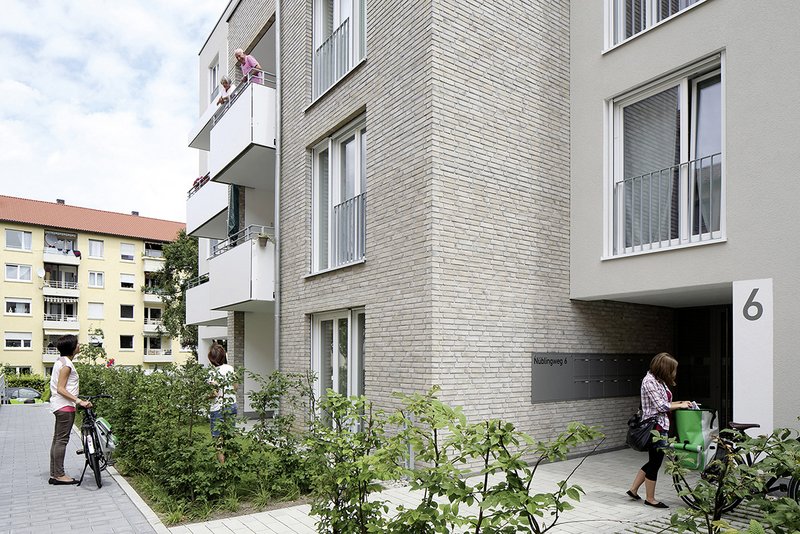 Die neue Bebauung interpretiert die Zeilenbebauung auf moderne Weise und fügt sich so harmonisch in die alte Stadtstruktur ein. Gleichzeitig bietet sie die Möglichkeit, bei späterer Planung die Bebauung der Umgebung weiterzuentwickeln.Der neue Baukörper wird hinsichtlich den mangelhaften Faktoren Besonnung und Aussicht optimiert: Durch Verschieben in Ost-West-Richtung sowie Staffelung der Höhe von drei bis fünf Geschossen erhalten fast alle Wohnungen eine Südorientierung der Wohnzimmer. Die 3-Zimmer-Wohnungen sind zudem noch von Osten und Westen belichtet. Durch den Gebäudeversatz wird auch der unstrukturierte Zwischenraum zum Nüblingweg gegliedert und die Aussicht der Wohnungen durch die Schaffung von diagonalen Blickachsen in die Weite geleitet. In den Ebenen +3 und +4 ergeben sich großzügige Dachterrassen.