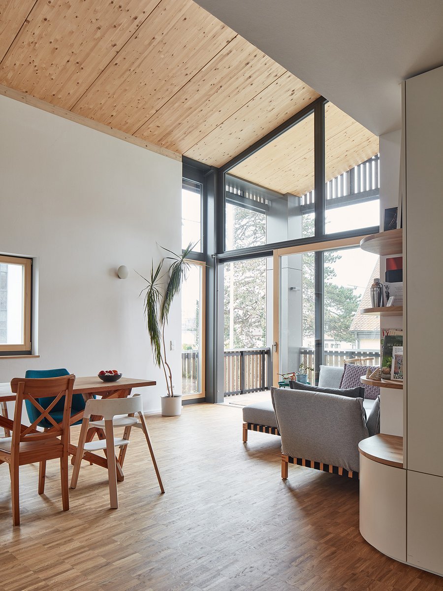 Anstatt der Ausbildung eines Kniestocks im niedrigen südlichen Teil des Dachgeschosses wurde der Wohnbereich und die Loggia der südlichen Wohnung im 1. Obergeschoss bis zum Dach geführt. Dies führt zu einem schönen Raumerlebnis, den Einbau einer kleinen Arbeitsgalerie über der Küche und ist auch wohltuend als Akzentuierung auch in der Fassade ablesbar. Durch die gewählte Dachgeometrie konnte die Architektur geschärft und von störenden Dachaufbauten komplett freigehalten werden. Die beiden südlichen Dachflächen wurden mit großflächige PV-Anlagen belegt, die den Effizienzhaus Standard 55 unterstützt.