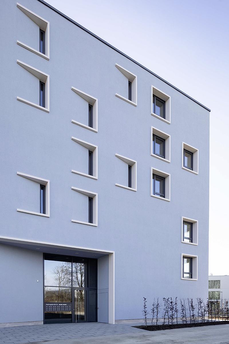 Städtebaukonzept / AußenanlageDer 6-geschossige Baukörper stellt sich als klarer, kubisch gestalteter Solitär dar und markiert die Eingangssituation in das neue Wohngebiet. Die Strenge der Fensterrasterung wird durch bewusst gesetzte Unterbrechungen sowie die Asymmetrie der langgezogenen Schielung des Eingangsbereichs aufgehoben.Der zur Hochvogelstraße orientierte Zugang zum Gebäude ist als zweigeschossig-überhöhter Rücksprung ausgebildet. Es entsteht ein einladender Vorplatz, der gleichzeitig einen geschützten Übergangsbereich zwischen Innen und Außen bietet.Das Gebäude umfasst 17 Wohneinheiten und 22 Tiefgaragenstellplätze sowie die erforderlichen Nebenräume (Keller-, Fahrrad-, Wasch-/Trocken-, Technik- und Müllräume).