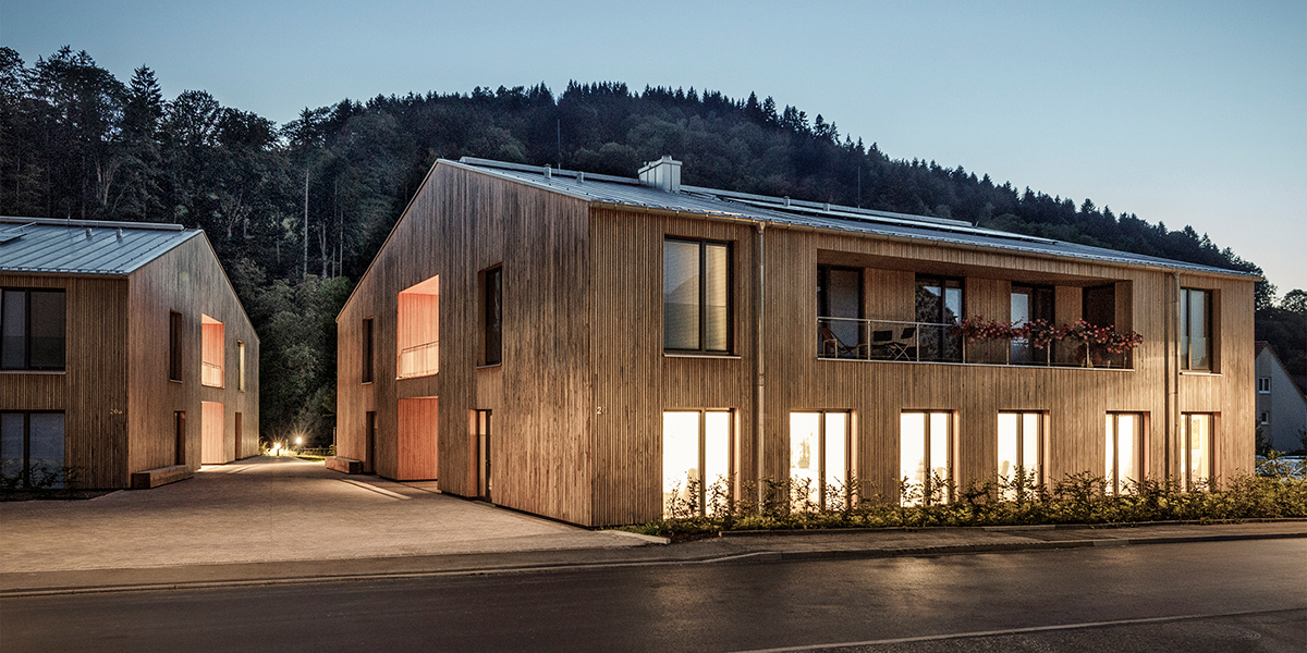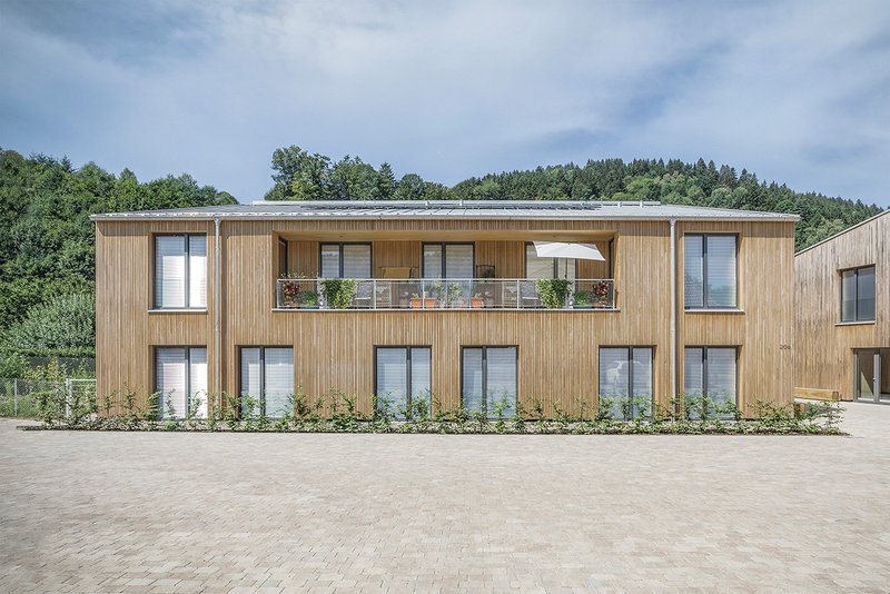 KonstruktionBeide Gebäude folgen einem klaren Konstruktionsprinzip. Das Obergeschoss, die Dachkonstruktion sowie die Außenwände wurden in Holzrahmenbauweise ausgeführt, während das Erdgeschoss in Holzhybridbauweise erstellt wurde. Stahlbetonstützen in der Fassadenebene sowie die Treppenhauskerne tragen die Massivdecke, die in Hinblick auf hohe Schall- und Brandschutzanforderungen eine optimale Lösung für die sensiblen Bereiche von Wohngruppe und Tagespflege bietet. Die opaken Außenwände sind mehrschalig in Holzbauweise mit vorgehängter, hinterlüfteter Fassade aus senkrechten Holzlamellen in Weißtanne auf Fuge ausgeführt. Die Fensterkonstruktionen bestehen aus hochwärmegedämmten Holz-Aluminium-Verbundfenstern mit integriertem Sonnenschutz. Die Wände des Treppenhauses und der Eingänge sind ebenfalls mit Leisten aus Weißtanne bekleidet und lassen fließende Übergänge zwischen Innen- und Außenraum entstehen. Der hölzerne Innenausbau der Gemeinschaftsbereiche wurde für Wände und Decken in Weißtanne ausgeführt und lässt zusammen mit dem Eichenparkett eine besondere Atmosphäre und Vertrautheit entstehen. Durch die konsequente Reduzierung bzw. Substitution von Beton wurde der Anteil von Holz in Konstruktion und Ausbau auf besondere Weise gefördert. Die Verwendung von Schwarzwälder Weißtanne aus regionaler Forstwirtschaft war von Beginn an ein wichtiges Projektziel und Anliegen aller Beteiligten.