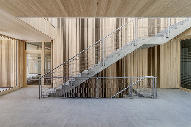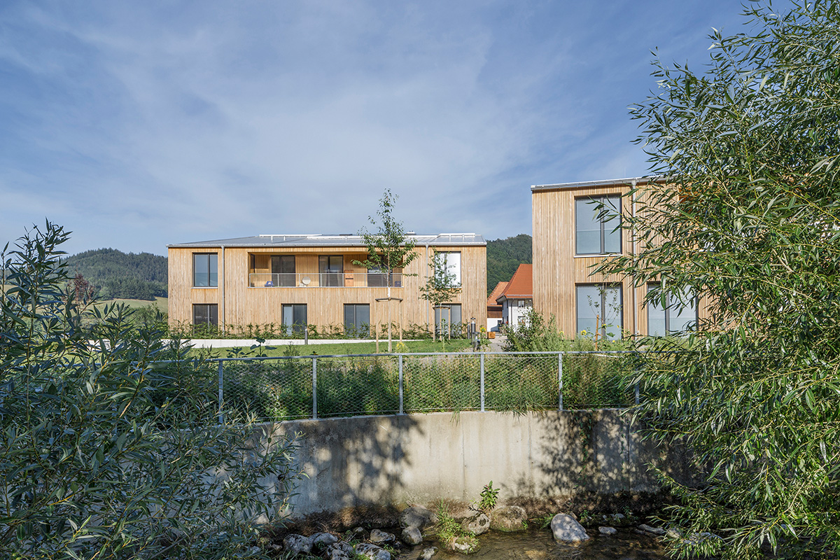 KonzeptBereits im Architekturwettbewerb überzeugte das Konzept der zwei kompakten Wohnhäuser, die das Mehrgenerationenprojekt in das öffentliche Leben von Oberried einbinden, ohne den Charakter einer institutionellen Pflegeeinrichtung zu vermitteln. Das Projekt umfasst den Neubau einer bürgerschaftlich verantworteten Tagespflege mit Betreuungs-Apartments und einer selbstverantworteten Pflege-Wohngemeinschaft im Erdgeschoss sowie zehn barrierefreien Mietwohnungen im Obergeschoss. Durch ein großzügiges Dachoberlicht fällt Tageslicht über das Treppenauge bis hinunter in den Eingangsbereich. Der zentrale Treppenraum gibt dem Haus eine luftige Mitte und dient als Treffpunkt für die Bewohner. Alle Wohnungen verfügen über Loggien die einen wettergeschützten Freiraumbezug und vielfältige Ausblicke in die dörfliche Umgebung bieten. Der Einsatz von Holz erzeugt in den Innenbereichen eine harmonische, wohnliche Atmosphäre und vermittelt ein Gefühl von häuslicher Geborgenheit und Behaglichkeit. Die raumhaltigen Dächer lassen großzügige Wohnräume mit einer prägnanten Geometrie entstehen.