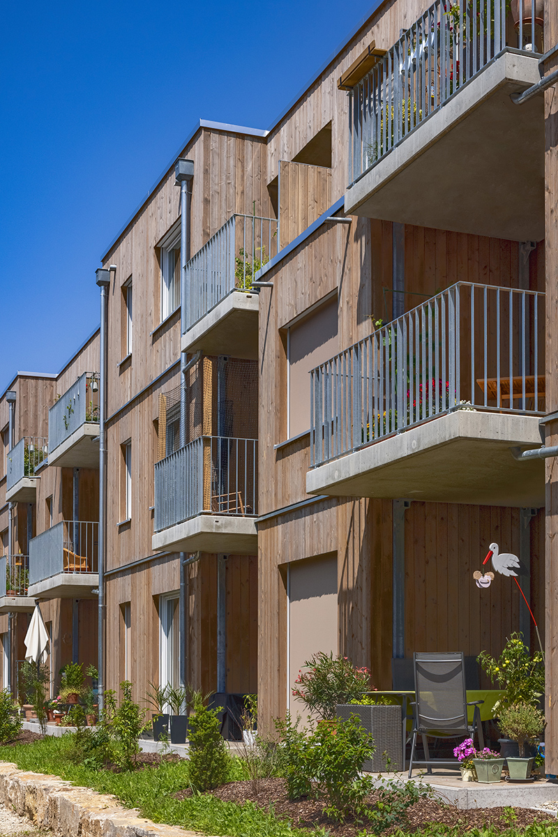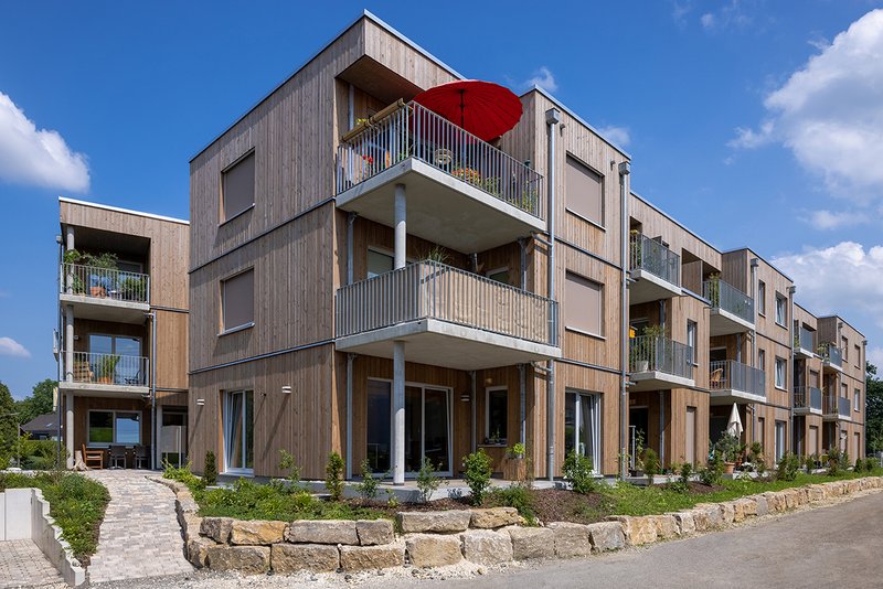 Eine sinnfällige Materialwahl gehört ebenfalls zum nachhaltigen Ansatz des Gebäudes. Die Holz-Außenwände sind in einer Dicke von 18 cm ausgeführt. Dies nicht aus statischer Notwendigkeit, sondern um die positiven Eigenschaften des Holzes für das Innenraumklima zu nutzen. Die Dämmung konnte einlagig mit 12 cm relativ gering aufgebracht werden. Das Gebäude erreicht einen KfW-Effizienzhaus-Standard 55. Im Betrieb hat sich jedoch gezeigt, dass der tatsächliche Energieverbrauch des Gebäudes weit unter einem KfW-Effizienzhaus 40 liegt. Im Außenbereich müsste das Holz bei Bauteilen wie Balkonen aufwändig vor Nässe geschützt werden. Hier wurden der Ästhetik der Einfachheit folgend Stahlbetonfertigteile verwendet. Die mit einem Dachüberstand geschützten Fenster sind reine Holzfenster, die dem Wetter ausgesetzten Fenster Holz-Alu Fenster. Um den Holzbau auch während der Bauphase vor Nässe zu schützen, wurden im Erdgeschoss unter den Außenwänden Betonschwellen gegossen, da viele Feuchteschäden im Holzbau auf die Bauzeit zurückzuführen sind. Die Holzwände sind so komplett aus dem Erdreich gehoben worden.