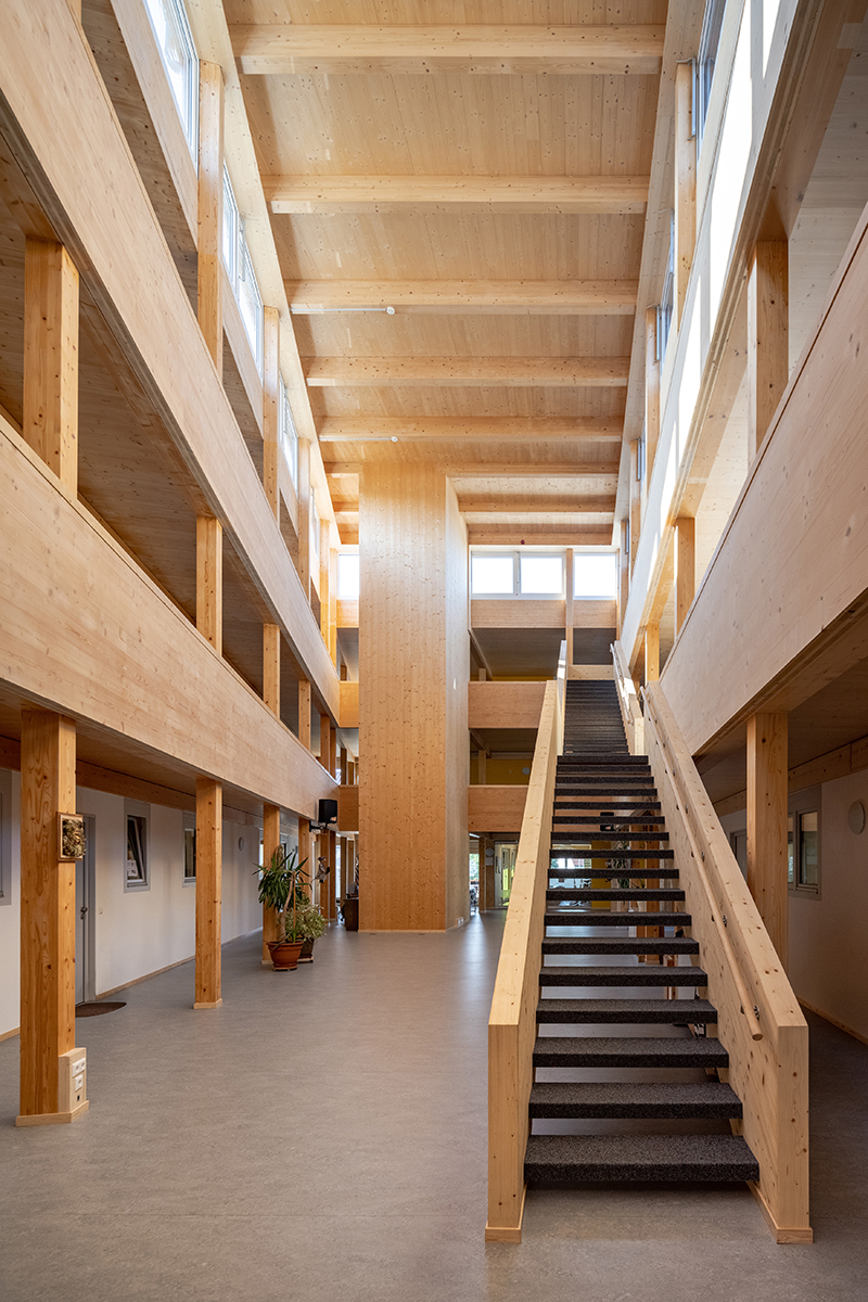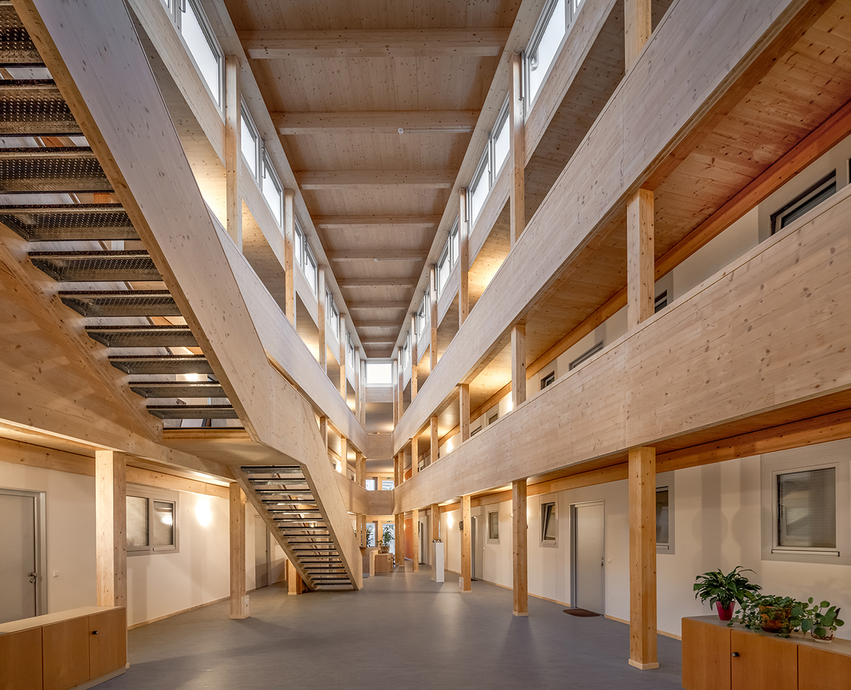 InnovationFrühzeitige Unterstützung der Planung von Gebäuden durch computergestützte Simulationen sind innovative Ansätze, derer sich das Planungsbüro bedient hat. Bereits im Entwurf wurde mittels thermischer Simulationen geprüft, dass das Atrium als thermische Pufferzone dient und nicht überhitzt. Die Klassifizierung des Projektes in die Gebäudeklasse 4 stellt erhöhte Anforderungen an den Holzbau bei den Aspekten Schallschutz und Brandschutz. Auch die Brandsimulation zu einer frühen Phase im Projektablauf konnte garantieren, dass der innenliegende Laubengang im Brandfall durch die großen Lüftungsöffnungen als außenliegender Laubengang gesehen werden kann. Dies ermöglicht uns die Holz-Sichtoberflächen, auch im Atrium, wodurch der Holzbau von innen und durch die Holzfassade auch von außen erlebbar ist.