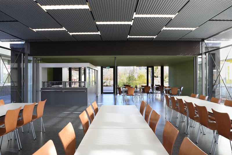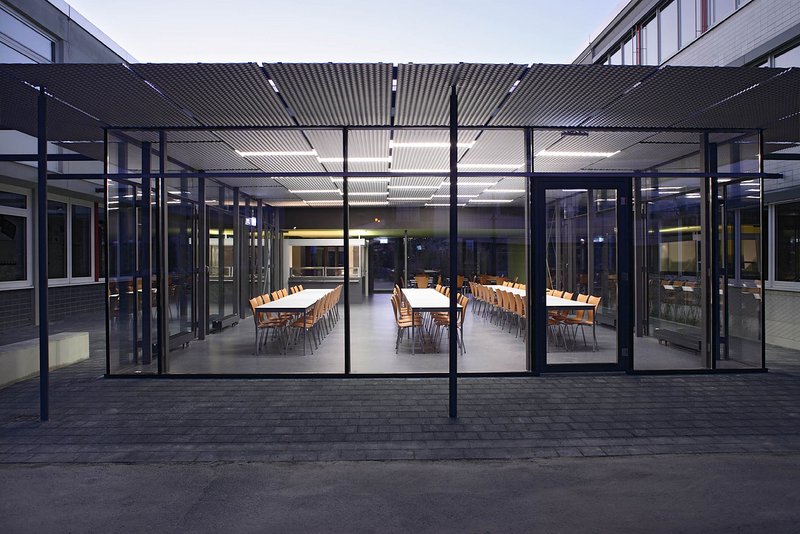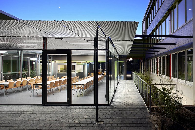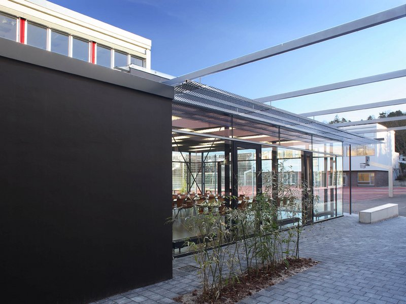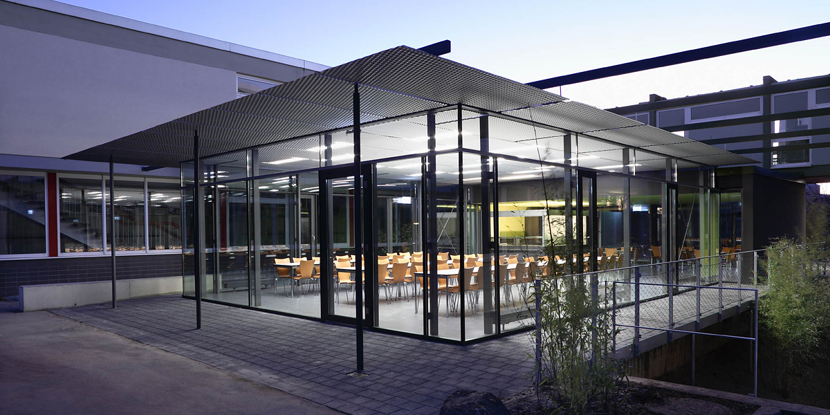 Der neue Baukörper der Mensa beinhaltet alle notwendigen Nutzungen, wie Essbereich, Cafeteria und Küche. Die gewählte Bauform vermittelt zwischen den Schulgebäuden und den Freiräumen und übernimmt sowohl gestalterisch als auch nutzungsbetont Mittenfunktion. Die Speiseräume sind mit einer leichten und transparenten Holz-Stahlskelettkonstruktion zwischen die bestehenden Baukörper hineingewoben und mit feinen linearen Stahlkonstruktionen konstruktiv mit dem Bestand verbunden.