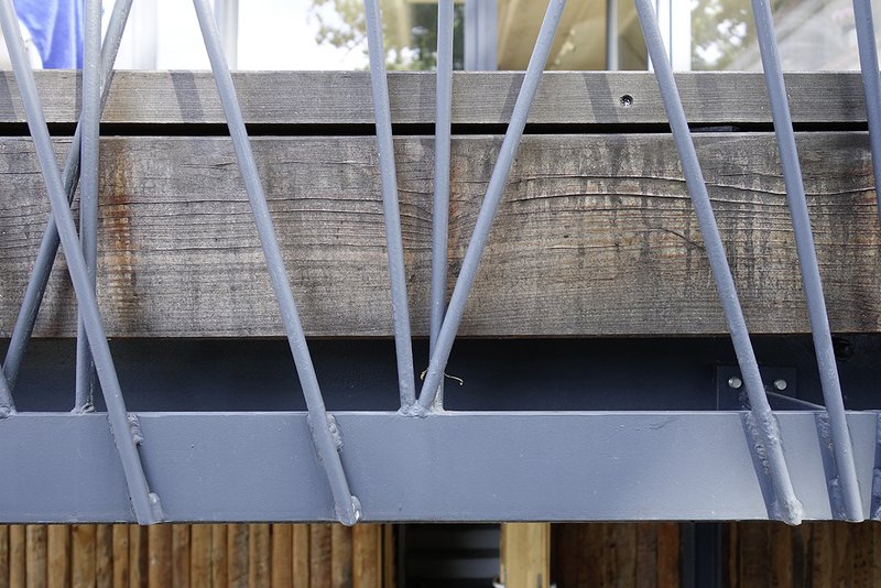 Holzdeck / Balkon:Der Bauherr konnte eine Maschinenbühne in seinem Betrieb vor der Verschrottung retten. Diese dient als Unterkonstruktion für das Holzdeck auf der Südseite. Eine Stahlbrüstung wurde als leichtes spielerisches Stabwerk ergänzt.