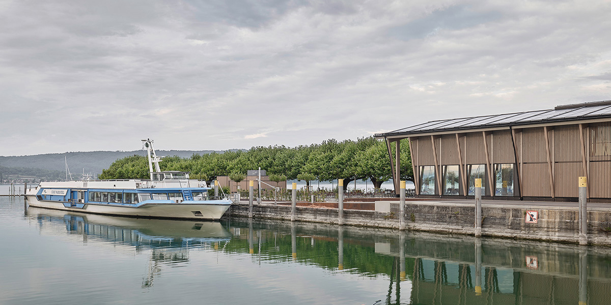 Das neue Gebäude auf der Hafenmole in Radolfzell beinhaltet eine Gastronomie, ein Ticket- und Informationsbereich der Bodenseeschiffsbetriebe, sowie öffentliche WCs.