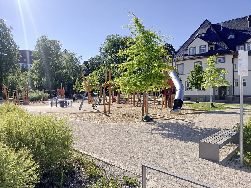 Mühlbachareal I und II BA: Mühlbachpromenade und InklusionsspielplatzIn einem ersten Bauabschnitt wurde der südliche Abschnitt der Mühlbachpromenade realisiert. Anstelle früherer Industriebebauung direkt am Wasser bringt eine breite Promenade eine neue städtische Verbindung. Als Auftakt schafft eine räumliche Aufweitung einen grünen Platz am Bach. Ein Kai mit einer Wasserstufe bietet die Möglichkeit direkten Kontakt mit dem Wasser aufzunehmen und die Füße im Mühlbach zu erfrischen. Ein Erlebnis, dass den Bewohnern bisher verwehrt blieb. Die ebenfalls denkmalgeschützte Natursteinmauer begleitet den Mühlbach oder besser den Mühlbachkanal als blaues Band und industrielles Erbe. Die Promenade setzt sich in einem zweiten Abschnitt fort und führt zur ehemaligen Direktorenvilla. Der angrenzende Inklusionsspielplatz nimmt das Thema der Spinnerei gestalterisch auf in einem roten Faden und einem Rutschturm in Form einer Spindel. Hier kann generationsübergreifend, mit und ohne Handicap, gespielt geschaukelt und entspannt werden. Aus dem ehemaligen Direktorengarten ist noch ein wertvoller Baumbestand aus exotischen und einheimischen Baumexemplaren erhalten. Die Grünfläche zum Mühlbach wurde mit der Skulptur „Endlos“ des Ettlinger Bildhauers Werner Pokorny bereichert. Ein Balkon und ein Steg über den Bach knüpfen neue Wegebeziehungen und schaffen Sichten auf das Wasser und die Stadtmauer. Über die visuelle Vernetzung hinaus wird so eine räumliche Überwindung der ehemals separierten Räume geschaffen. Die trennende Wunde wird vernäht und der Mühlbach erhält eine neue Adresse und Bedeutung. Ein weiterer, barrierefreier, Zugang zum Mühlbach öffnet eine neue Perspektive in der Achse des Baches und wird ein wichtiger neuer Freiraum für die zeitgleich entstehende Wohnbebauung. Ein grüner Strand mit Hängematten und Sitzstufen als zeitgemäße Chillout-Zone.