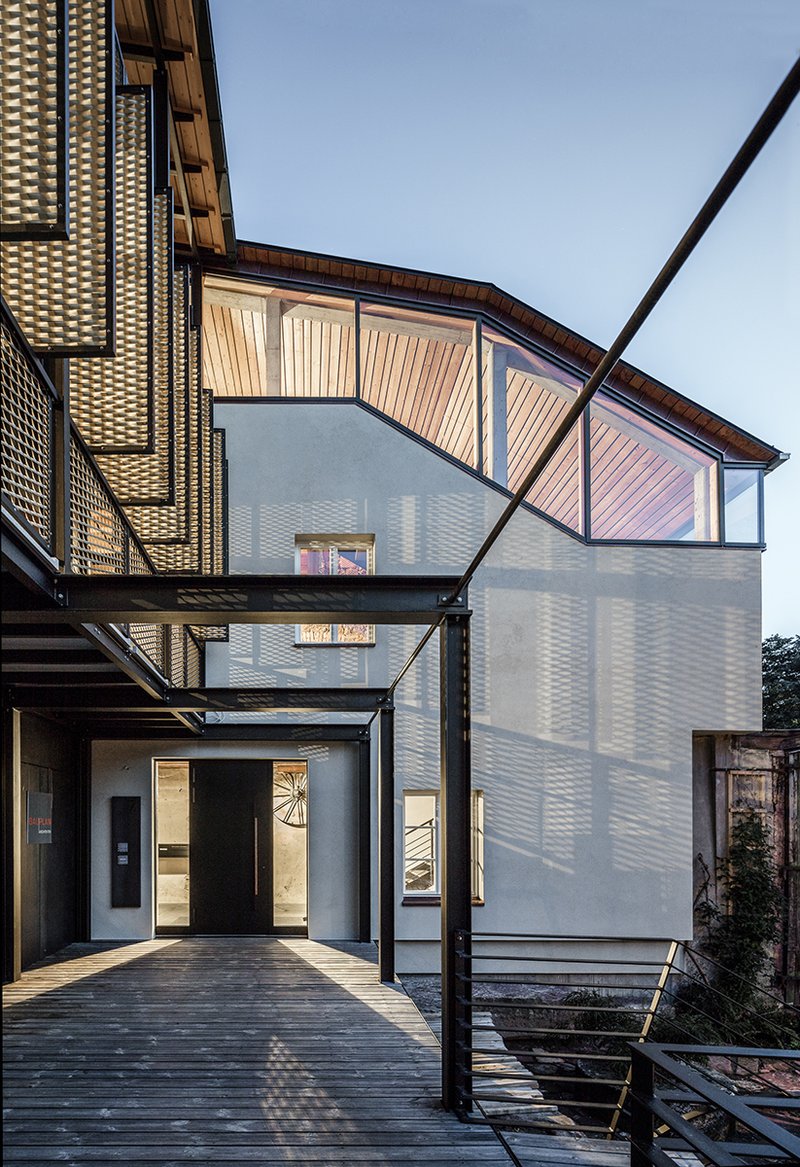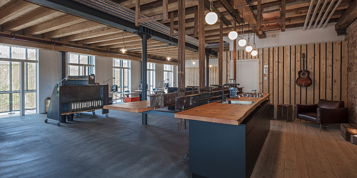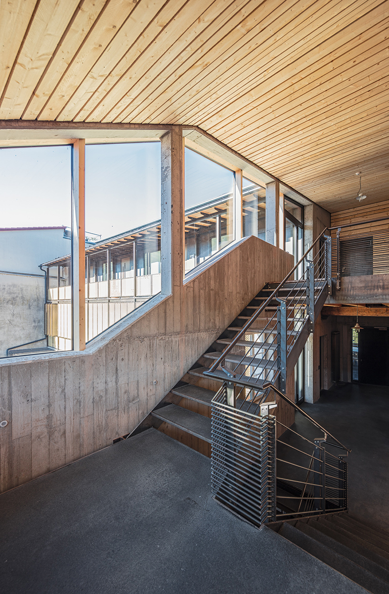 Das Gebäude wurde in seiner letzten Form belassen, das Tragwerk für eine neue Nutzung parallel zum alten aufgebaut, die Decken als Holz-Beton-Verbund-Decken ertüchtigt und das nicht zu sanierende Dach als Holzkonstruktion neu aufgebaut.