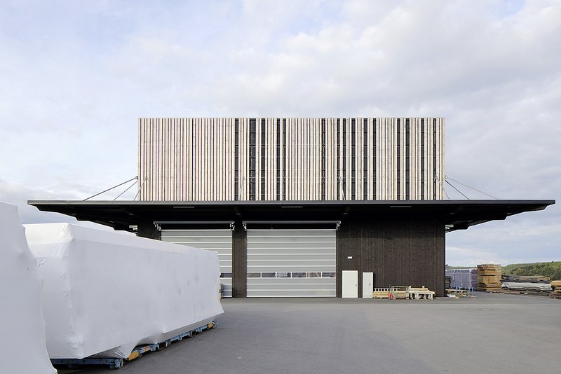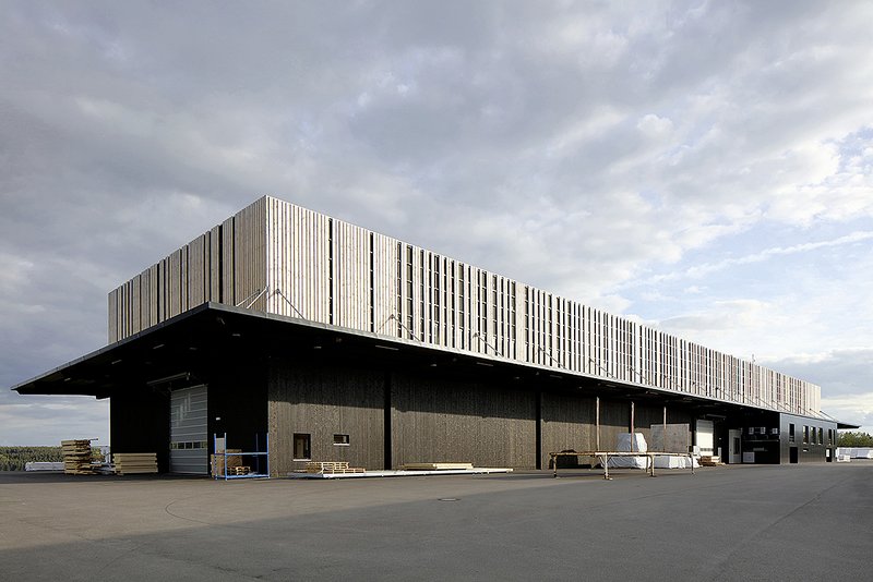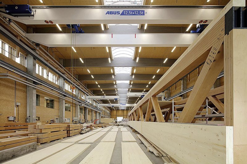 Eine Produktionshalle für HolzbauwerkeEin mittelständisches Holzbauunternehmen wächst ständig. Als Vision 2008 geboren nahm das Projekt langsam Gestalt an. Über die Jahre wurden viele Varianten entwickelt, die letztendlich 2017 als "Zukunftswerkstatt" konkretisiert wurden. Die Halle ist ein multifunktionaler Ort, an dem von klassischen Holz-Abbund-Arbeiten über die Modulbauproduktion bis zu Robotik Arbeiten in Zusammenarbeit mit der Universität Stuttgart, unter einem Dach durchgeführt werden können. Das Gebäude gliedert sich in eine große Halle, die umlaufend ein großzügiges Vordach erhält und einen Anbau für die Verwaltungs- und Sozialräume. Das Vordach gliedert das hohe Gebäude in zwei Teile. Im oberen Bereich wurden Holzdielen montiert, die durch unterschiedlich breite Abstände die Fläche gliedern. Die Flächen unter dem Vordach wurden komplett dunkel gehalten. Konsequent ist das Gebäude in Holzbauweise errichtet worden, lediglich die eingespannten Stützen und die Bodenplatte wurden in Stahlbeton ausgeführt. Der komplette Hallenraum wird natürlich über großzügige Oberlichter belichtet. Das Tragwerk der Kranbahn wurde erstmals mit unterspannten Baubucheträgern realisiert. Das Vordach wurde aus recycelten Brettschichthölzern konstruiert. Das Nebengebäude wurde aus verschiedenen Brettsperrholzarten realisiert, Fichte, Zirbe oder Birke prägen die Innenräume. Die Fassade des Anbaus wurde mit recycelten Aluminiumverbundplatten verkleidet.
