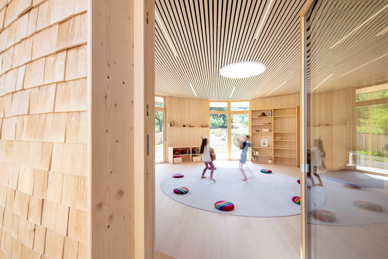 Alle Bauteile und Fügungen sind in hohem Maße zirkulär geplant, der Anteil nachwachsender Rohstoffe maximiert - der überwiegend verwendete Baustoff ist Holz. Wandbauteile und Bodenplatte bestehen aus gedämmten Rahmenkonstruktionen, die Decke aus Massivholz. Als Fassadenbekleidung kommen vertikale Holzlamellen sowie Schindeln aus Weißtanne zum Einsatz. Auch die Fensterrahmen und nahezu alle Oberflächen im Innenraum bestehen aus Weißtanne. Im zentralen Gruppenraum erzeugt ein Holzpellet-Ofen in den Wintermonaten Wärme und wird gleichzeitig als Kochstelle genutzt. Er vervollständigt damit den ganzheitlichen Ansatz eines zirkulären und nachhaltigen pädagogischen Konzepts