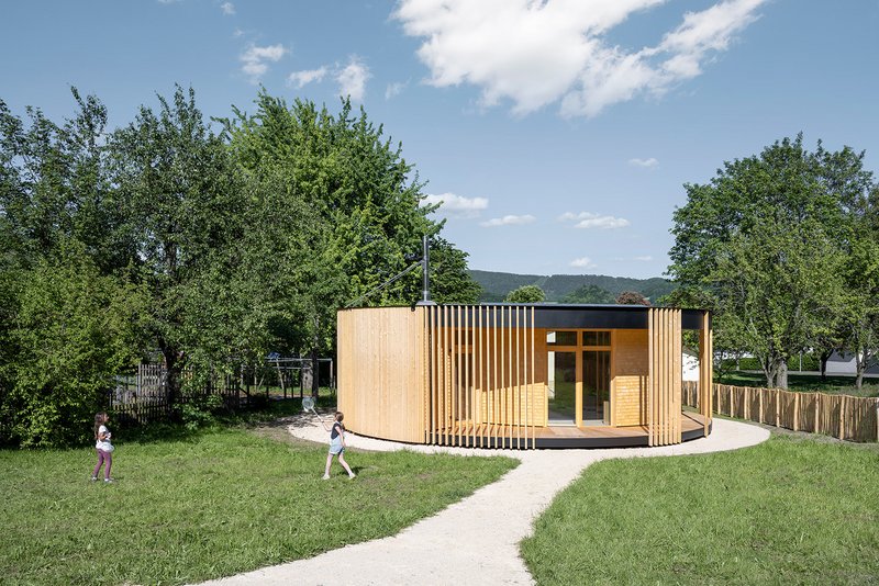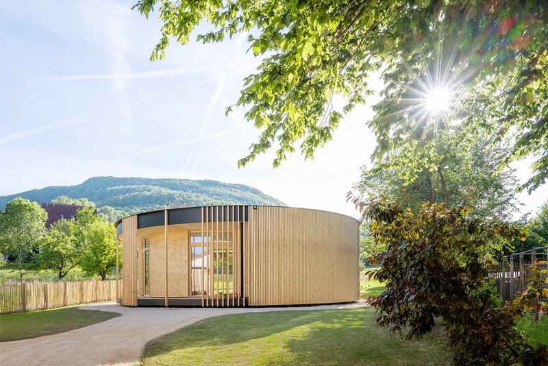 Die eingruppige Natur-Kita befindet sich in Randlage von Weilheim Hepsisau. Streuobstwiesen und die sanfte Hügellandschaft der Schwäbische Alb prägen den Charakter des Ortes. Durch den Neubau bleibt dieser wertvolle Naturraum fast vollständig erhalten, er wird so wenig wie möglich gestaltet oder verändert. Der kreisförmige Baukörper fügt sich harmonisch und zurückhaltend in den Kontext ein und ist minimalinvasiv auf Punktfundamenten vom Boden losgelöst gegründet. Das mit Photovoltaik belegte und biodivers begrünte Retentionsdach schafft nahezu vollständig einen ökologischen Ausgleich zur versiegelten Grundfläche.