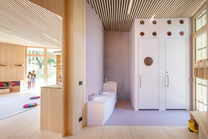 Der zentrale Gruppenraum bildet das Herz der Kita. Um ihn herum sind als ringförmige zweite Schicht die überdachte Pergola mit Zugängen sowie dienende Funktionen wie Garderobe, Sanitär und Teamraum angeordnet. Große, raumhohe Fassadenöffnungen und ein zentrales Oberlicht stellen direkte Verbindungen zum Außenraum her und machen den Wechsel von Wetter, Tages- und Jahreszeiten jederzeit erlebbar. Umlaufende Fassadenlamellen in unterschiedlichen Abständen filtern das einfallende Licht und erzeugen eine abwechslungsreiche Innenraumatmosphäre.