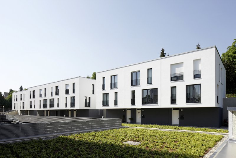 In zweiter Reihe, verbunden über den halböffentlichen Innenhof, artikulieren sich neun Reihenhäuser. Diese sind, ansetzend im zweiten Geschoss, über einem in den Hang geschobenen offenen Parkdeck und einer darunter befindlichen Tiefgarage positioniert. Eigenständig streng, fügen sich die klar strukturierten Wohneinheiten mit nichtöffentlichen Außenräumen in das Gesamtprojekt ein.