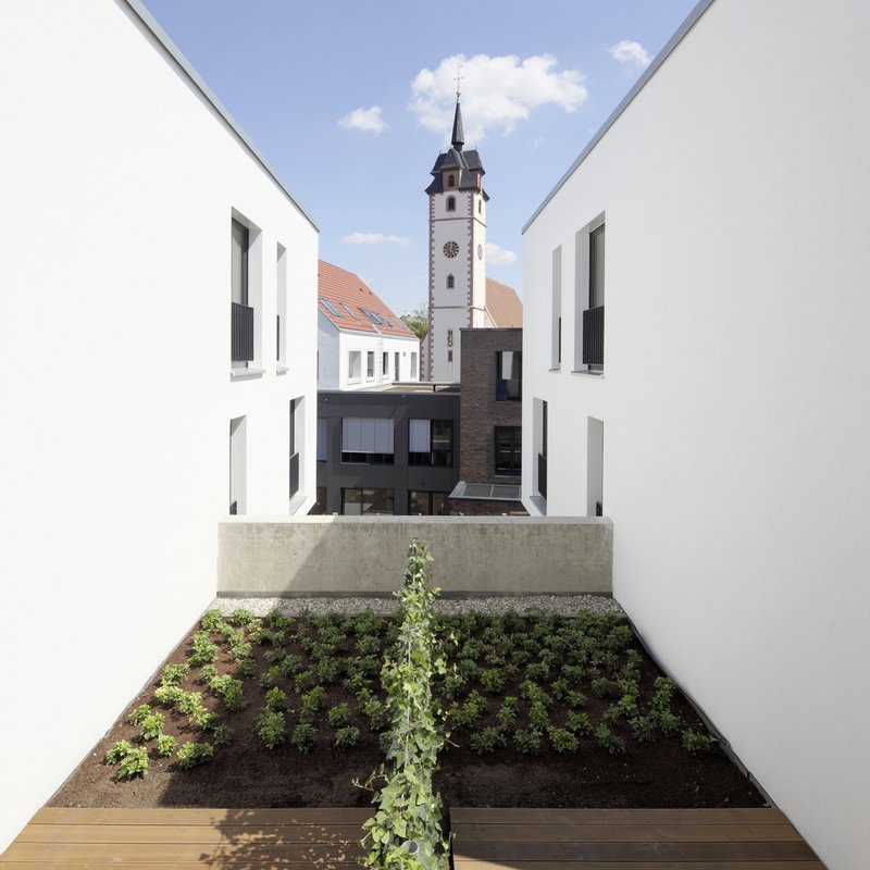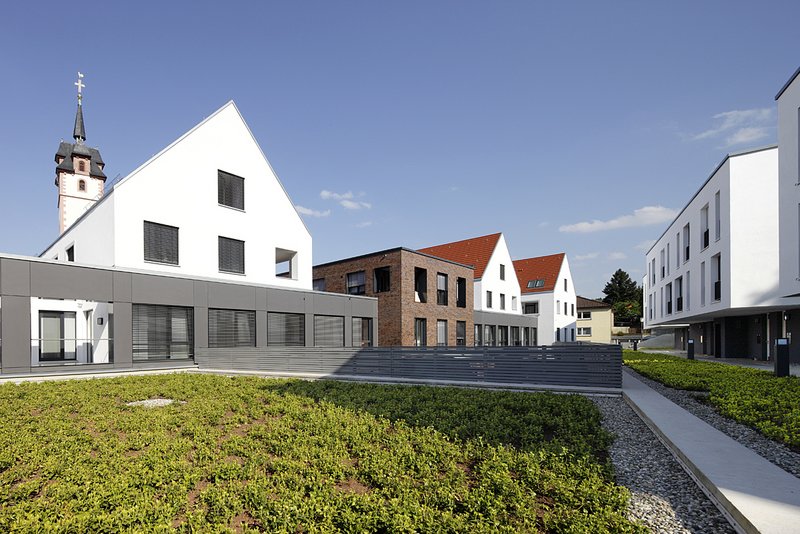 Das Konzept beinhaltet die Nutzungen Poststelle, Optiker, Bank, Diakonie mit Sozialstation, Arztpraxis, Physiotherapeuten sowie Bäckerei mit Café. Integriert wurden in den vier untereinander verbundenen Baukörpern zusätzlich jeweils drei Maisonette-Wohnungen sowie zwei betreute Wohnungen. Die Architektur greift die ortstypischen Giebel und traufständigen Haustypologien auf und übersetzt sie in ein zeitgenössisches durchaus selbstbewusstes Auftreten gegenüber der denkmalgeschützten Ortskirche, eingebettet in die Reihung des Ortsbildes entlang der Hauptstraße.
