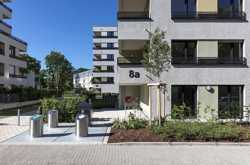 Quartier und AußenanlagenDie Neuordnung hat den Anspruch das soziale Gefüge des Gebietes trotz der Neugestaltung zu erhalten bzw. zu verbessern. Um die Außenanlagen freizuhalten, wurden die Fahrradabstellplätze in den Neubauten weitestgehend in das Untergeschoss und Erdgeschoss integriert und für die Abfallentsorgung ein Unterflur-System gewählt.