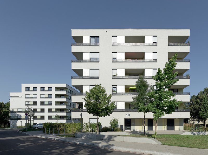 NeubauDen ersten Bauabschnitt der Neubauten bildet ein sechsgeschossiges Wohngebäude, das die östliche, markante Ecke des Grundstücks besetzt. Das 12-geschossige Bestands-Hochhaus wurde nach der Erstellung des ersten Bauabschnittes abgerissen. Mit dem Neubau wird der städtebauliche Auftakt für das Gebiet formuliert und gleichzeitig die Voraussetzung für den Umzug der Mieter:innen des abgängigen Hochhauses auf dem Grundstück geschaffen. Auf die Bewohner:innenstruktur abgestimmt, wurden 30 Wohneinheiten mit eineinhalb- bis drei Zimmern erstellt.