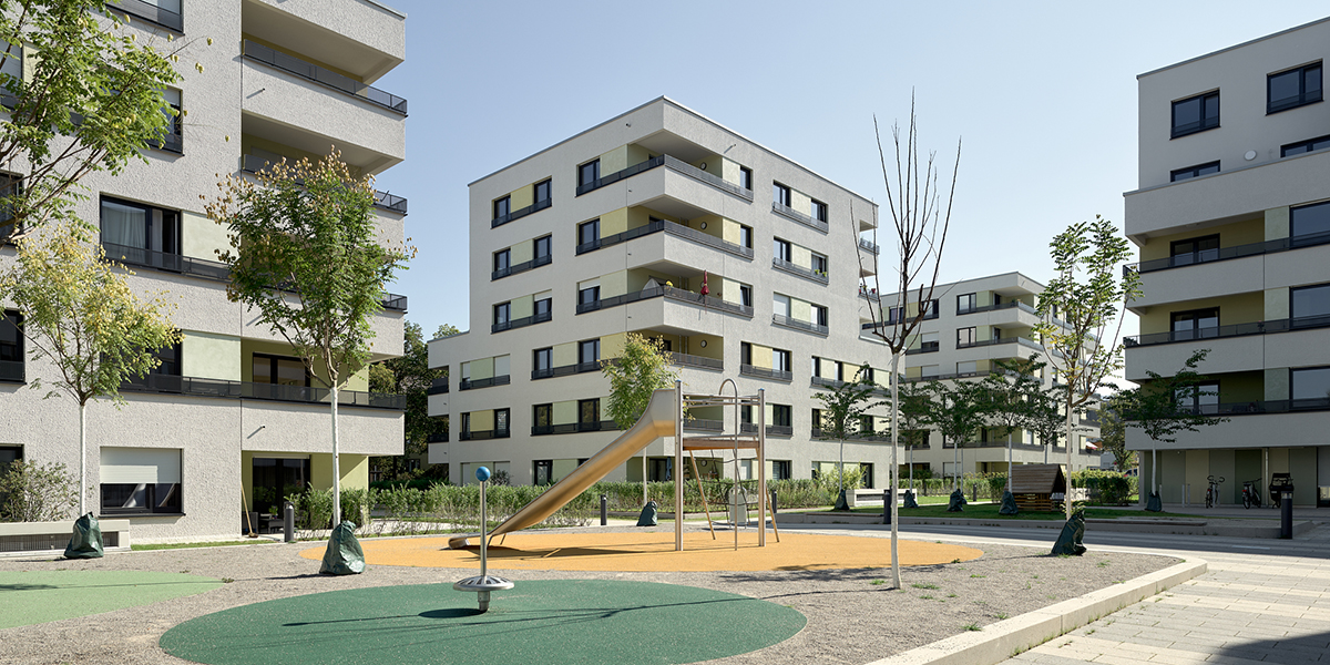 Hainbuchenhecken und freiwachsende Sträucher grenzen privat nutzbare Gartenräume ab. Die so entstehenden großzügigen Grünflächen dienen als Gemeinschafts- und Begegnungsflächen für die Bewohner:innen. Vor den Eingängen der Wohngebäude vermitteln kleine Platzsituationen mit Sitzmöglichkeiten eine Adresse und Aufenthaltsqualität.