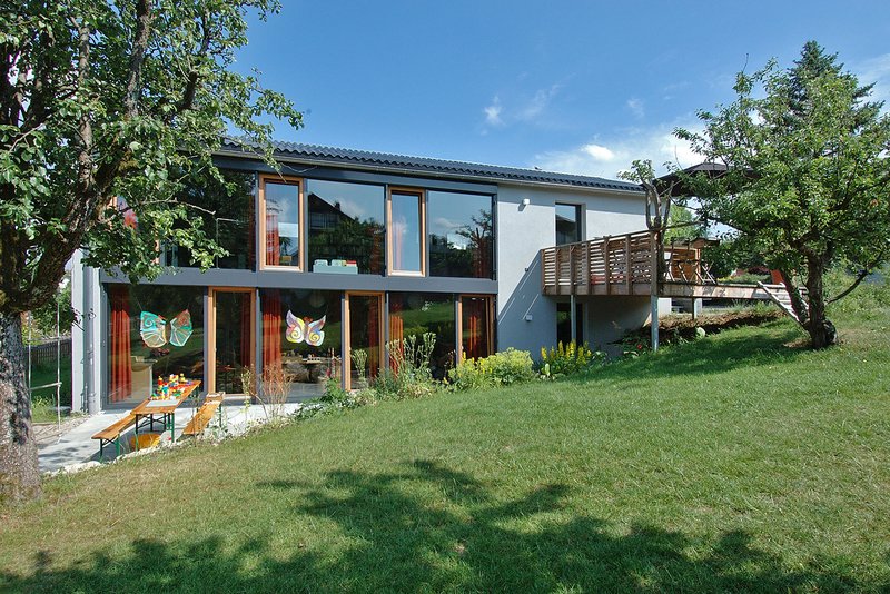 Durch höchste Anforderungen an die Ausführung der Gebäudehülle ist hier beispielhaft aufgezeigt, wie sich qualitätvolle Passivhausbauweise auch unter relativ schwierigen Umständen (Nordhang und Hauptausrichtung West bis Nord-West) realisieren lässt. Die gesamte Umfassungskonstruktion sowie sämtliche Innenwände sind aus monolithischem Ortbeton in Sichtbetonqualität ausgeführt. Hierdurch wird außer einem sehr guten Wärmespeichervolumen auch eine, im Blower-Door Test nachgewiesene, außerordentlich hohe Luftdichtigkeit erzielt. Durch integrierte Planung aller technischen Einrichtungen von Anfang an wurden mit den glatt geschalten und anschließend lediglich grundierten Sichtbetonbauteilen überdies erhebliche Kosten bei den Ausbaugewerken eingespart.