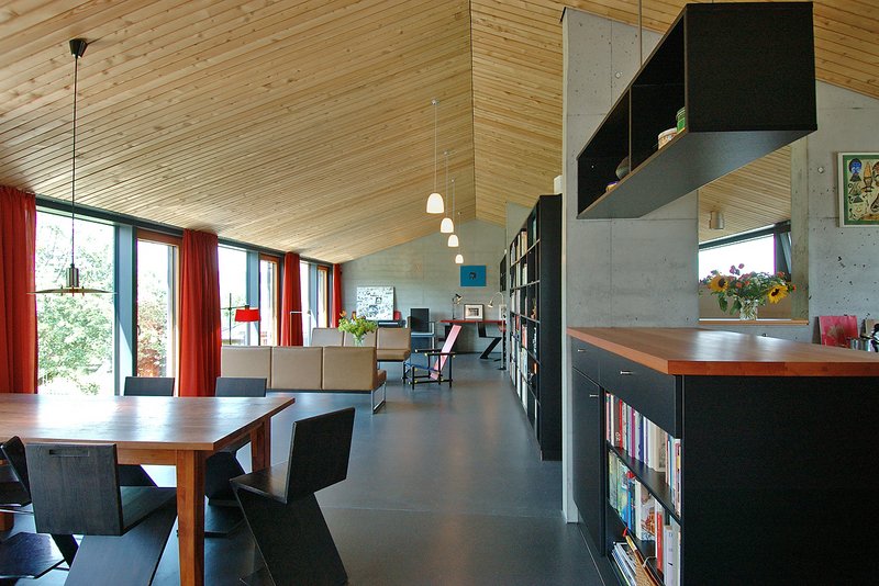 Als Ergänzung und gleichsam im Kontrast fügen sich alle übrigen verwendeten Ausbaumaterialien, die im Wesentlichen aus naturbelassenen Holzoberflächen (Lärche, Oregon Pine, Douglasie) bestehen, zu einem harmonischen, ruhigen und gleichzeitig modernen Gesamtbild ineinander. Zurückhaltend dunkel gestaltete Einbaumöbel, in die geschickt die notwendigen technischen Anlagen der kontrollierten Rumbelüftung baulich integriert sind, fungieren im offenen Grundriss als Raumteiler.