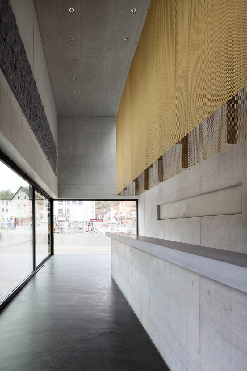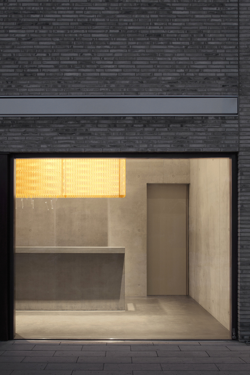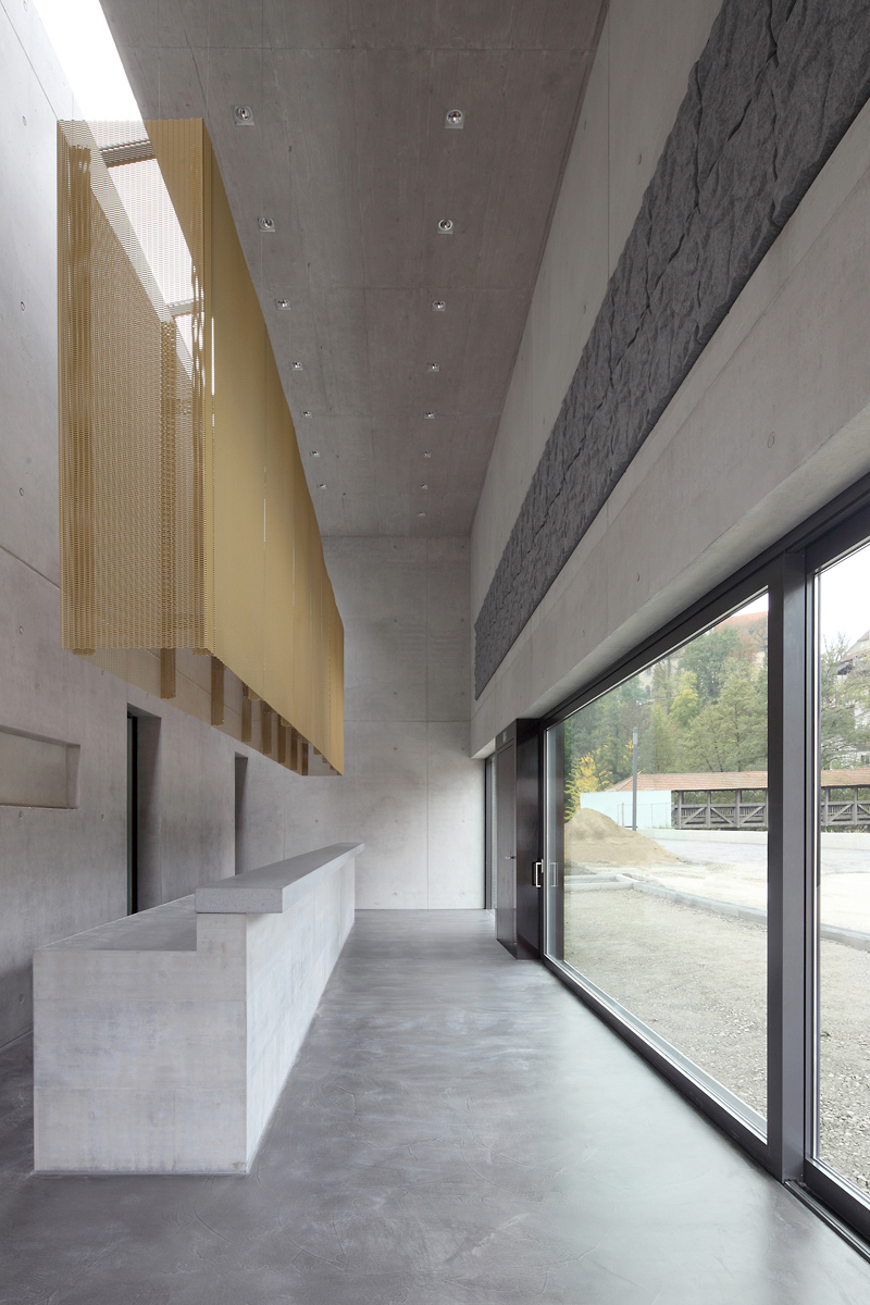 InnenraumGegen die silbergraue Vormauerschale heben sich die Innenräume mit den hochwertigen Sichtbetonoberflächen vorteilhaft ab. Die Espressobar erhält durch ihr lang gestrecktes Format und die lichte Höhe von 6,50 m eine besondere Ausstrahlung, welche durch das Oberlichtband und das liegende Fassadenband unterstrichen wird. Die 7,60 m lange Bar aus Sichtbeton betont den Raum und nimmt die Materialität der Wände auf. Die Leuchtskulptur über der Bar wirkt als Blickfang und lässt den Raum golden erstrahlen. Der Boden ist durch die dunkle Beschichtung wirkungsvoll gegen die Wände abgesetzt. Ein über 4,50 m breites Schiebefenster lässt ein Verschmelzen von Innen- und Außenraum zu.