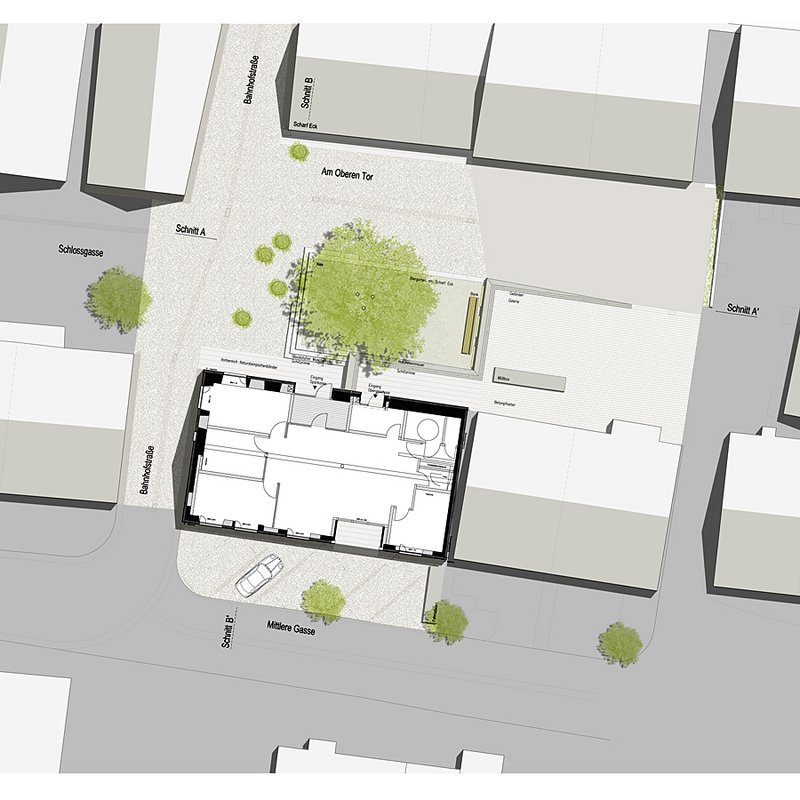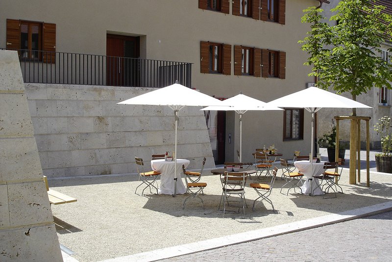 EntwurfDie Einfachheit und Kraft der wenigen eingesetzten Elemente prägt die Raumfolge und die Atmosphäre.Eine Mauer aus heimischem Muschelkalkstein bildet eine neue Kontur innerhalb der Freifläche und vermittelt zusammen mit Treppenlinien die unterschiedlichen Ebenen. Teppiche aus Muschelkalkplattenbändern formulieren zu den Eingängen eine einladende Geste. Inmitten der Raumsituation entsteht eine Platzfläche, die von der Gastronomie als Biergarten im lichten Schatten einer Kastanie bedient wird. Pflanzgefäße aus Cortenstahl, Sitzbänke aus heimischer Eiche und eine dezente Beleuchtung in den Abendstunden illustrieren den aktuellen Zeitgeist ohne aufdringlich zu sein.