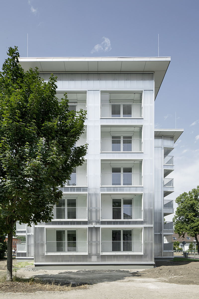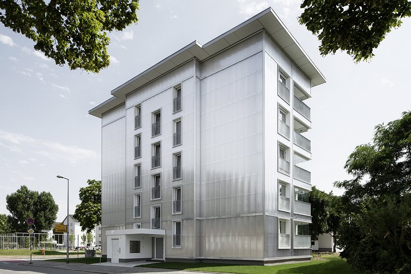 Energetische Sanierung Die energetische Sanierung steht im Mittelpunkt eines Forschungsprojektes, das die Deutsche Bundesstiftung Umwelt (DBU) gefördert hat. In dynamischen Modellen wurden solarenergetische Gewinne an Fassadenflächen optimiert, um zur Energiegewinnung und -speicherung für das Gebäude genutzt werden zu können. Im Zusammenspiel von aktiven und passiven energetischen Maßnahmen nahm die Gestaltung einer klimaaktiven Fassade mit Loggien und Luftkollektoren eine ebenso bedeutende Rolle ein wie die Einbindung von Speichermassen. Zur Erhöhung der Speichermassen wurde der Kellergeschossgrundriss geändert. Da sich die Wohnungsanzahl geändert hat, sind große Flächen für die Abstellräume weggefallen. Diese Flächen haben sich für die Speichermassen umbauen lassen. Im Zusammenspiel von aktiven und passiven Maßnahmen auf allen Ebenen (Wärme, Kälte, Luft, Licht, Strom, Wasser, Abwasser) konnte der Energiebedarf in Simulationen auf ca. 11 kWh/m²a minimiert und zugleich die Energieversorgung optimiert werden. Jede einzelne Komponente wurde in ein Gesamtsystem integriert.Die Außenwände des Gebäudes wurden mit einer vorgehängten hinterlüfteten Fassade aus Lichtbauelementen versehen. Über Lüftungsrohre auf dem Dach, die Ost- und Westfassade verbinden, und über das Kellergeschoss entstand auf diese Weise ein geschlossener Luftkreislauf. Im Kellergeschoss wurde eine locker geschichtete Speichermasse aus Kalksandsteinen eingebracht, die nach dem Prinzip der geraden Rostpackung angeordnet wurden. Über die auf diese Weise entstandene Luftschicht und den daran gekoppelten Speicherraum kann die Fassade im Winter passiv beheizt und im Sommer gekühlt werden. Als Material für die transluzente Gebäudehülle wurde eine 9-Kammer-Polycarbonatplatte mit einem U-wert von 0.83 W/(m²K) verwendet. Das kostengünstige Material erlaubte auch bei einem knappen Budget wie hier im sozialen Wohnungsbau eine innovative energetische Fassadengestaltung. Über eine Wärmerückgewinnung wird der warmen Abluft Energie entzogen, die zum Vortemperieren der kalten Frischluft genutzt wird. Auf diese Weise werden Lüftungswärmeverluste des Gebäudes verringert. Um Baukosten zu sparen, wurde auf eine zentrale Anlage verzichtet und stattdessen in jedem Wohnraum ein kostengünstiges Lüftungselement über jedem Fenster angeordnet.