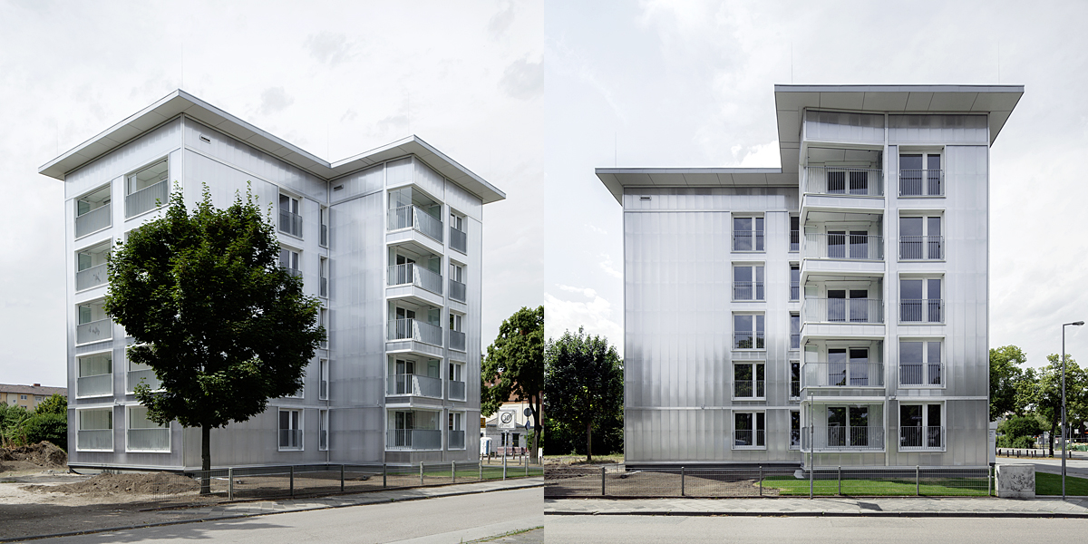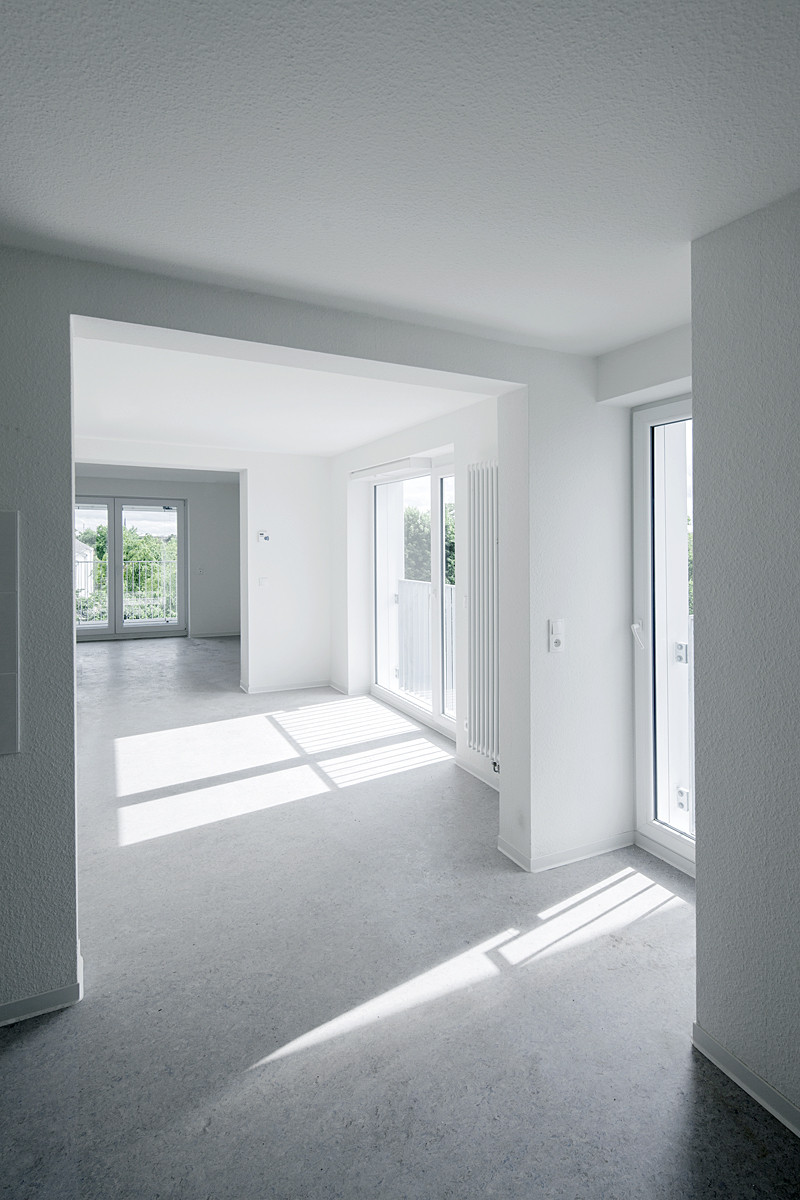 Typologie Der erste Baustein ist die typologische Optimierung auf heutige Wohnbedürfnisse. Vier ehemals minimal dimensionierte ca. 45 m² große Wohnungen, von denen zwei rein nord-ost- bzw. nord-west-orientiert waren, wurden zu zwei angemessen großen 90-m²-Wohneinheiten zusammen-geschaltet. Der neue Kochbereich bildet das warme Zentrum der Wohnungen, um das sich vier Individualräume anordnen. Die Erschließung sowie die Bäder bilden eine energetische Pufferzone nach Norden. Das fünfgeschossige Gebäude wurde um eine innenliegende Aufzugsanlage erweitert, die je zwei Wohnungen pro Geschoss erschließt. Die bestehenden Brüstungen wurden entfernt und somit lichte Raumeindrücke durch raumhohe Fensterelemente geschaffen.