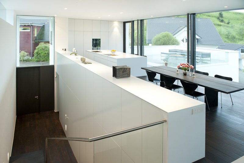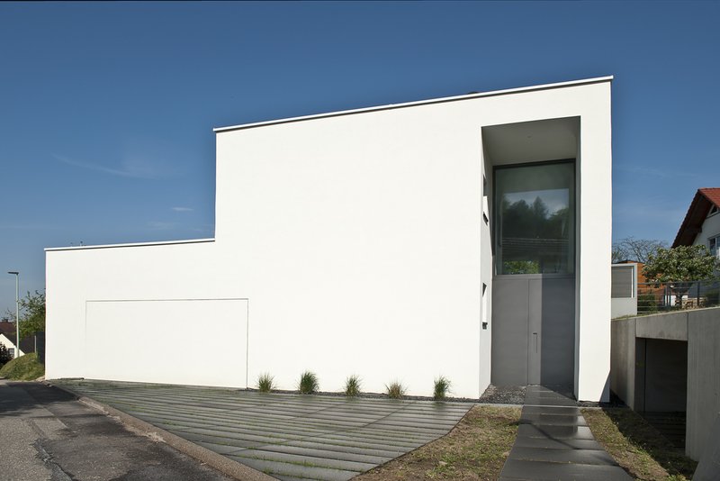 Bedingt durch den schmalen und sehr langen Grundstückzuschnitt sowie die Geländeform und die Vorgaben im Bebauungsplan wurde ein puristischer Baukörper entwickelt, der sich in das Gelände eingräbt und sich in der Hauptorientierung nach Süd-Westen ausrichtet, was dem Grundgedanken des Passivhauses optimal entspricht. Der Baukörper ist sorgfältig ausgeschnitten und definiert durch Einschnitte und Rücksprünge Eingang und überdachte Freibereiche, welche dem Gebäude Tiefe und Charakter verleihen. Die Eingangsfassade des Gebäudes ist komplett geschlossen, einzig der Zugang wird durch einen zweigeschossigen, portalartigen Einschnitt markiert. Die Schlafräume im Erdgeschoss liegen unterhalb des Geländeniveaus und werden durch einen geschlossenen, introvertierten Gartenhof belichtet. Dieser ist vom Straßenniveau nicht einsehbar. Eine Holztreppe aus eingeleimten Kragstufen führt vom Eingang in das Obergeschoss, welches galerieartig an einen zweigeschossigen Luftraum anschließt. Hier befindet sich der offene Wohn-, Koch- und Essbereich. Die große Raumhöhe sowie die großflächigen Verglasungen verleihen dem Raum seine Großzügigkeit. Die horizontalen Rahmenprofile der Pfosten-Riegel-Konstruktion sind boden- und deckenbündig eingelassen und spiegeln den puristischen Gestaltungsansatz auch im Detail wieder. Dem Wohnbereich schließen sich zwei Terrassen an, welche durch ihre unterschiedliche Lage und Ausrichtung verschiedene Aufenthaltsqualitäten bieten.