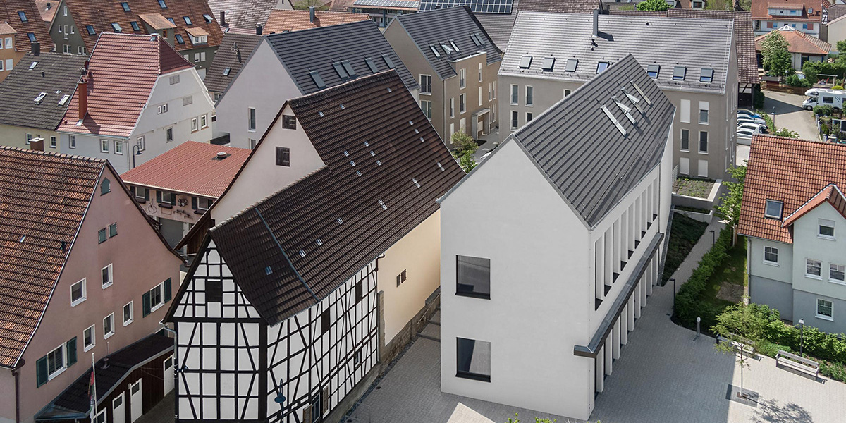 Das neue Quartier liegt im Bereich des alten Ortskerns von Bondorf. Gebäude mit steilen Giebeln und großen ruhigen Dachflächen prägen das Bild. Ein schlanker Baukörper fügt sich an der Grabenstraße behutsam in die vorhandene Umgebung ein. Der Bau mit dem Bürgerhaus und der Bücherei präsentiert sich selbstbewusst mit einem Vorplatz zum öffentlichen Raum. Als Visavis der Remigius-Kirche bildet dieser Platz vor dem Keltensaal den Auftakt einer neuen Raumabfolge in der Ortsmitte von Bondorf. Das Bürgerhaus wird im Inneren Z- förmig erschlossen. Das Foyer verbindet den Vorplatz an der Grabenstraße über den Innenhof in Richtung Lange Gasse. Der Römersaal öffnet sich zum Innenhof und kann in den Freibereich erweitert werden. Die Bibliothek in der oberen Ebene wird über eine Split-Level-Treppe und einen Aufzug erschlossen.