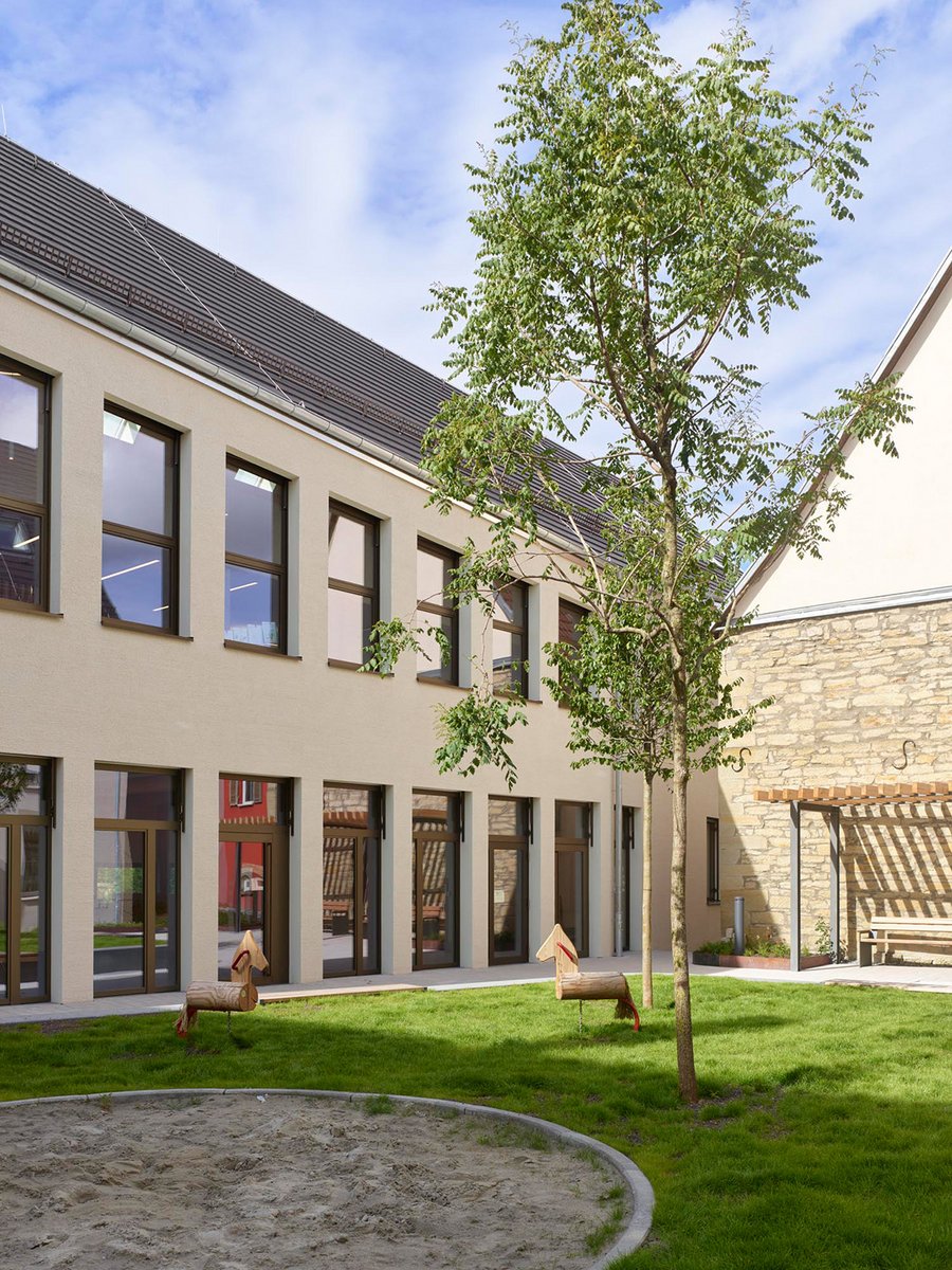 Der Innenhof bietet Platz für gemeinsame Hoffeste, Kinderspiel und Aufenthalt mit direktem Kontakt zum Bürgerhaus und der Bibliothek. Eine Pergola und eine Baumgruppe bieten wechselnde Aufenthaltsmöglichkeiten in Sonne und Schatten. Fußläufig gelangt man von der Grabenstraße über die Lange Gasse in den Innenhof beim Kindergarten und von dort zur Hochwiesenstraße. Ein gefahrloser Weg für Fußgänger, für Senioren und für die jüngeren Mitbewohner führt durch das neue Quartier. Die Lange Gasse wird zur Wohn- und Spielstraße. Die Fahrbahn aus Asphalt, akzentuiert durch Pflasterbelagsflächen, lädt zum Bespielen ein – so wird die Lange Gasse wieder zu einem lebendigen Treffpunkt im Quartier.
