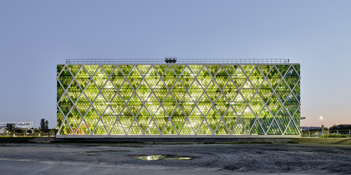 Die Vielseitigkeit der Anforderungen haben die PlanerInnen als Potenzial verstanden und sich auf die Suche nach einer spezifischen Lösung begeben. Daraus entstand die Idee einer Konstruktion mit großen Spannweiten und einer auf das Wesentliche reduzierten und zugleich multifunktionalen Fassade: So bildet die außenliegende Stahlkonstruktion aus rautenförmigen Stahlträgern mit einer Stahlbetonverbunddecke zugleich die Hauptkonstruktion und Hülle des Gebäudes. Über der Stahlkonstruktion spannt sich auf der Süd-, Ost- und Westseite ein Edelstahlnetz, das als Absturzsicherung und als Rankhilfe für die Begrünung und als natürliche Belüftung dient.