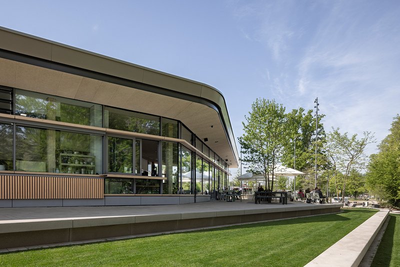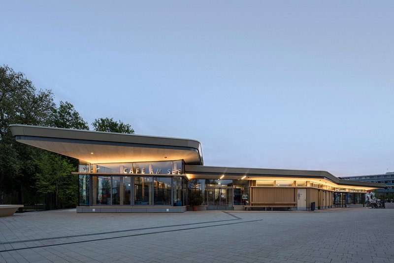 Besondere Bedeutung kommt zudem der Seeterrasse zu, die den Anlagensee zugänglich machen wird. Das Café wird mit seiner Außengastronomie den Park Richtung See öffnen und anbinden. Das Untergeschoss ist kompakt und funktional organisiert. Neben den Technikräumen einem Fahrradwaschplatz und den Fahrradstellplätzen für das Valetparken sind hier Flächen für Mieträder, Reparaturräder und Lastenräder vorgesehen.