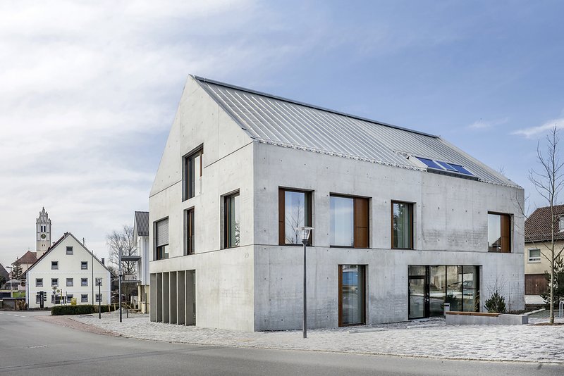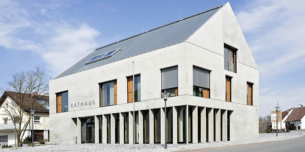 Ein Ensemble aus Sonderbausteinen (das neue Rathaus, die Gemeindehalle und das Raiffeisenbankgebäude) definiert den Ortskern. Das neue Rathaus fügt sich darin wie selbstverständlich ein. Durch leichtes Verdrehen des Baukörpers öffnet sich der südliche Vorbereich, der Rathausplatz, zur Kreuzung mit dem Dorfplatz an der Halle. Dabei ist die baukörperliche Ausprägung schlicht und angemessen gehalten, stattdessen wird der besonderen Bedeutung des Gebäudes durch die Feingliederung und die innere Struktur Rechnung getragen. Innerhalb des kompakten Baukörpers ist das Gebäude in zwei Bereiche gegliedert. Ein repräsentativer "Kopf" mit Foyer, Bürgerbüro und darüberliegendem Sitzungssaal und ein funktional gegliederter Verwaltungsteil für die Büroräume. Dazwischen sind die andienenden Räume und die Vertikalerschließung angeordnet.