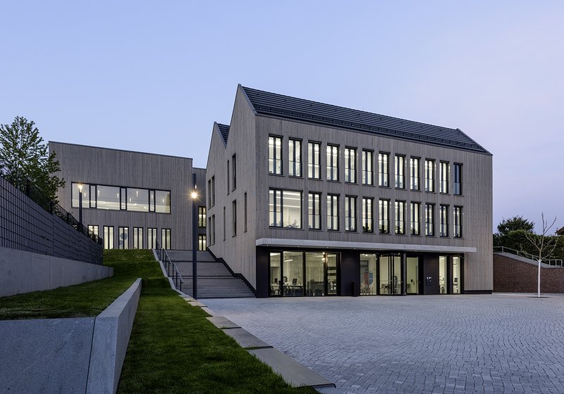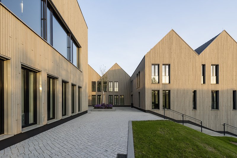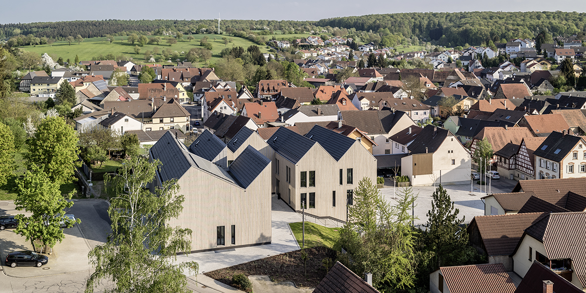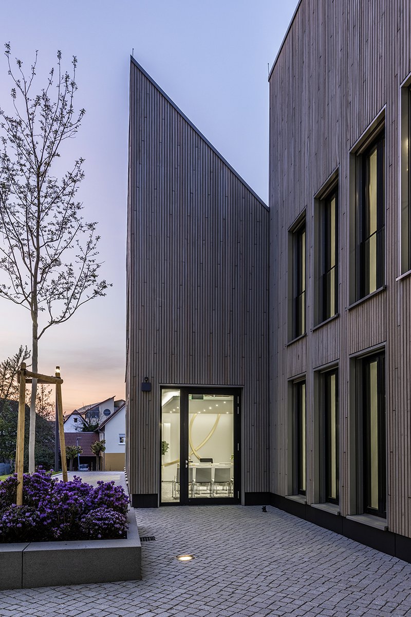 Um den großen Baukörper in das städtebauliche Umfeld zu integrieren, wurde eine bewegte Dachlandschaft mit diversen Satteldächern entwickelt, die sich auf die Proportionen und die Körnung seines Umfeldes einlässt. Die Wiederholung der filigranen Dächer erzeugt einen besonderen stadträumlichen Charakter und suchen eine nahtlose Integration in den Ortskern. Dabei verleihen sie dem Baukörper eine charakteristische Modernität, die mit der Wahl der vorvergrauten senkrechten Holzverkleidung verstärkt wird. Eine Modernität, die die Anpassung an den alten Ortskern nicht scheut.
