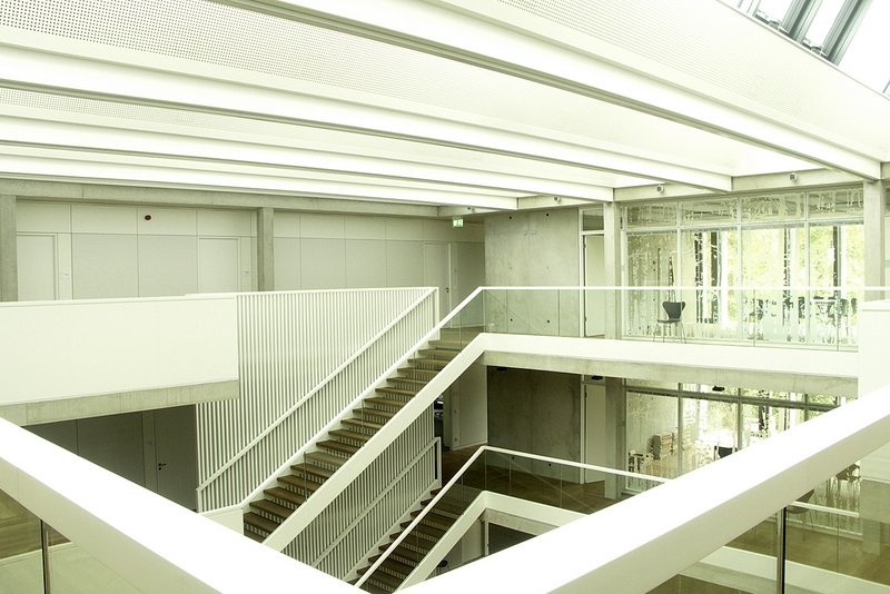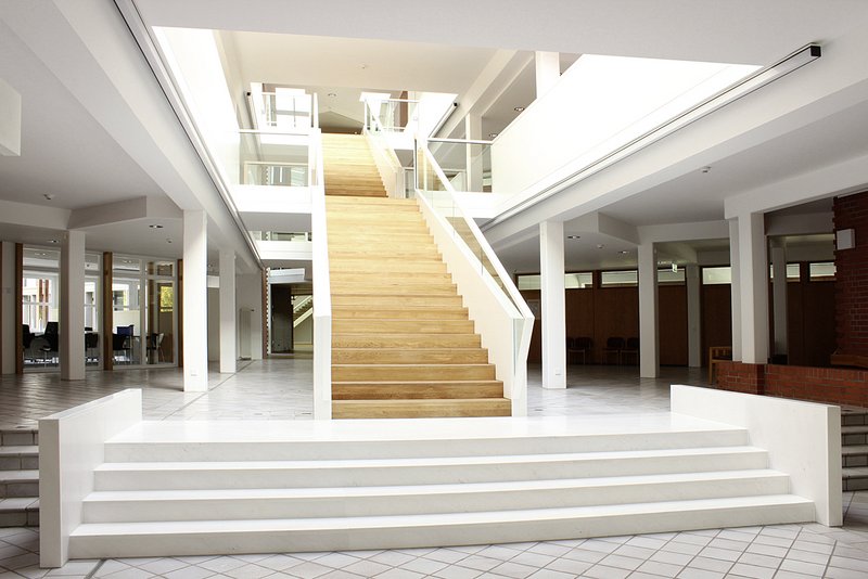 Der neu konzipierte Baukörper - ein quadratischer Würfel am Ende der Diagonalen - wird dadurch selbstverständlich und folgerichtig erschlossen. Die Erweiterung erhielt ein großzügiges Foyer über drei Geschosse. Alle Büros sind umlaufend in den beiden Obergeschossen über Galerien erschlossen. So entsteht ein neuer, zentraler, attraktier Raum im Rathaus, der sich bestens für Veranstaltungen und Ausstellungen als Gegengewicht zum Innenraum des alten Foyers und zu den beiden Ratssälen eignet.