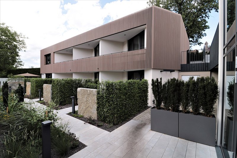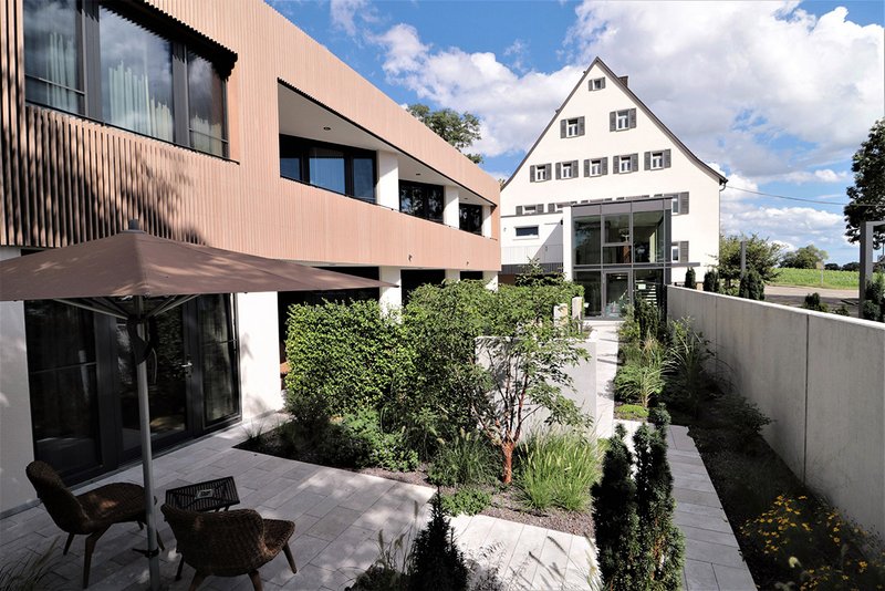 Der vorgelagerte begrünte Innenhof wurde durch eine Betonmauer gefasst und schafft so die räumliche Distanz zur Straße und zu den Parkplätzen. Dadurch konnte größtmögliche Privatsphäre für die Hotelgäste mit einem nicht alltäglichen Ambiente sichergestellt werden.