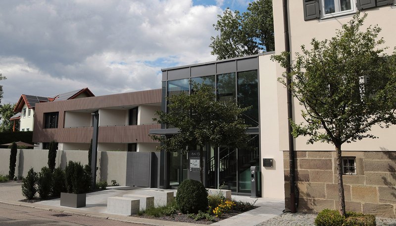 Äußere GestaltDie Bauaufgabe wurde durch zwei klare zweigeschossige Baukörper, welche mit einer Brücke verbunden, sind gelöst.Die Auflösung der einzelnen Funktionen in Einzelbaukörper ermöglichte dabei eine kleingliedrige Gebäudestruktur. Dabei haben diese einen eigenständigen und selbstbewussten Auftritt und versuchen sich nicht an das Bestandsgebäude anzupassen, sondern stehen hierzu im Kontrast. Ein gemeinsames Farbkonzept, Aufnahme von vorhandenen Strukturen und Proportionen und eine angepasste Materialwahl vermitteln jedoch zum Bestandsgebäude und schaffen eine Einheit.