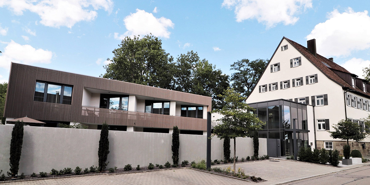 StädtebauDas Bauprojekt befindet sich am Rande des Dorfgebietes von Weckrieden mit vorwiegend traditioneller Bebauung und unmittelbar an der Stadteinfahrt nach Schwäbisch Hall. Dabei bildet das denkmalgeschützte Hauptgebäude einen markanten Auftakt. Als einzig möglicher Standort für die Erweiterung kam der seitlich vorhandene Parkplatz in Frage.