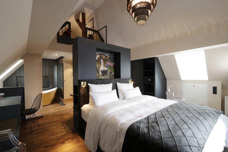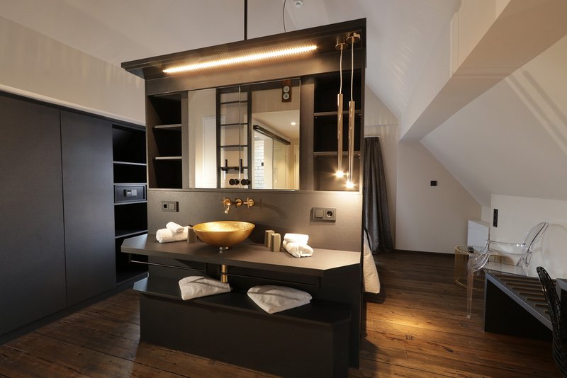 Der Erhalt von drei Kachelöfen und einiger Innentüren war ebenso Vorgabe des Denkmalschutzes. Diese wurden in die Innenausbauplanung und die Farbkonzeption der Zimmer integriert. Die individuelle Gestaltung der Hotel- und Badezimmer mit unterschiedlichen Material- und Farbkonzeptionen, individuell ausgewählten und angefertigten Möbeln verleiht jedem Hotelzimmer eine ganz eigene, besondere Atmosphäre.