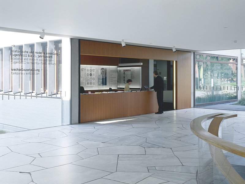 Bauliche Instandsetzung und Umbau InnenraumIm Innenraum wurden nach Auszug der ursprünglichen Nutzung der Stadtbibliothek zunächst alle Teakholzeinbauten zur Aufarbeitung durch Tischler und Restauratoren ausgebaut. Nach Aufbau von für den Museumsbetrieb notwendigen Brandschutz- und Klimaabschnitten in transparenter Glas-Stahl-Bauweise sowie dem erstmaligen Einbau einer Kühldecke und der Frischluftversorgung über eine Belüftungsanlage, konnte mit dem Wiedereinbau des restaurierten Einbaumobiliars begonnen werden, bei dem insbesondere der über 40 m lange Einbauschrank entlang der Bürozone im Obergeschoss besticht und dessen Furnier seinerzeit aus einem einzigen Stamm geschält worden war. Dieser einzigartige Befund wie auch das weitere Mobiliar konnten gesichert und einer veränderten Nutzung für die Verwaltung des Schmuckmuseums, des Museumsshops sowie des Cafés zugeführt werden – teilweise unter Ergänzung gestaltungsverwandter Möbel wie der Shoptheke oder den Bareinbauten des Cafés durch die Architekten. Bis auf die Sonderzone der Dauerausstellung wurden alle weiteren Räume des Museums erneut mit dem für die Bauzeit typischen tannengrünen Linoleum belegt.