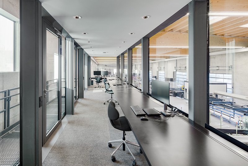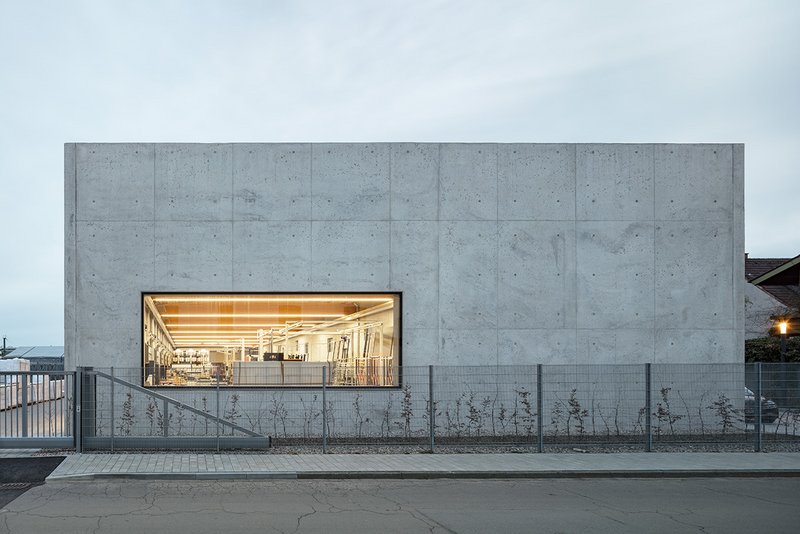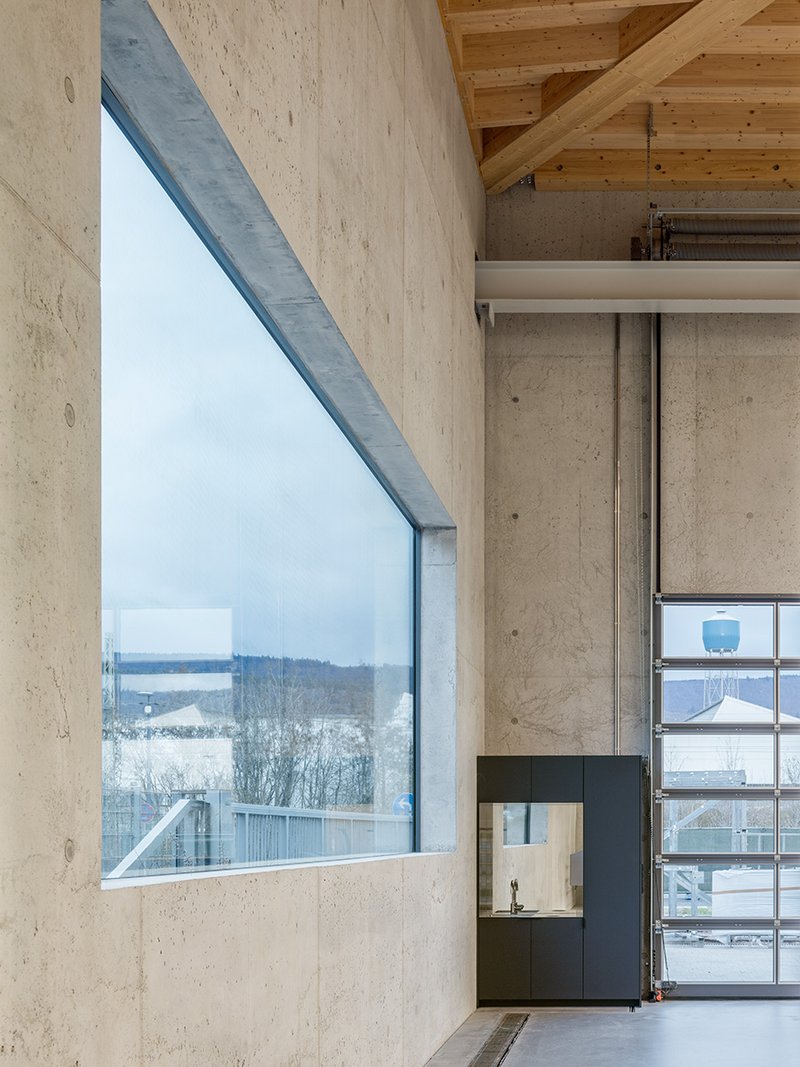 EntwurfDie Entwurfsidee war, eine minimalistische, monolitische Produktionshalle aus Leichtbeton zu errichten, konstruktiv und energetisch optimiert. Alle Oberflächen wirken durch die Materialität und deren Farblichkeit. Rahmenlose Fenster schließen die Öffnungen in den Wänden. Die Dachkonstruktion besteht aus sichtbaren Leimholzbindern mit darauf liegenden Sparren. Durch die Fenster mit integrierten Lichtlenklamellen, die Lichtkuppeln und die verglasten Tore ist die Halle mit Tageslicht durchflutet. Zwischen den Doppelleimbindern integrierte LED Bänder versorgen die Halle mit Kunstlicht. Medienschränke in jeder Achse versorgen die Produktion. Die Wände und das Dach bleiben weitestgehend frei von Installationen. Ein maximal nutzbares Volumen für die Produktion.