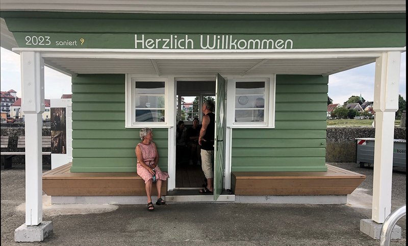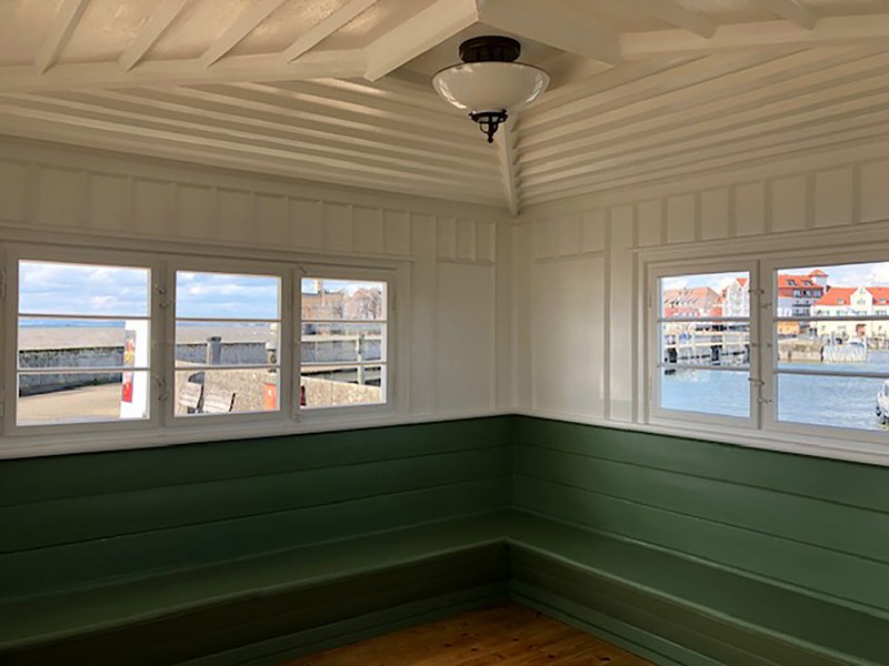 Das jetzige „Dammhäusle“ wurde im Jahre 1927 anstelle eines Vorgängerbaus (vermutlich 1904-1926) als Holzbau errichtet. Als witterungsschützender Wartebereich für die Passagiere der Bodenseepersonenschifffahrt, verfügt es über innen und außen umlaufende Sitzbänke unter einem großen, flachen Walmdach. Eine ursprüngliche Lasur der Holzoberfläche ab 1927 erwies sich bald als wenig witterungsbeständig, weshalb nach wenigen Jahren ein deckender Ölanstrich innen und außen aufgebracht wurde. Dieser historische Grünton mit diversen gliedernden weißen Absetzungen wurde mit Zustimmung des Landesdenkmalamtes als zweite historische Farbfassung im Frühjahr 2023 rekonstruiert. Bedenkt man, wie vielen Seestürmen das „Häusle“ an dieser exponierten Stelle einen Widerstand geleistet hat, ist man beeindruckt von der vorgefundenen, verformungsfreien Holztragkonstruktion. Diese wird nach einer fachgerechten Instandsetzung und einer denkmalgerechten Restaurierung viele weitere Generationen erfreuen.