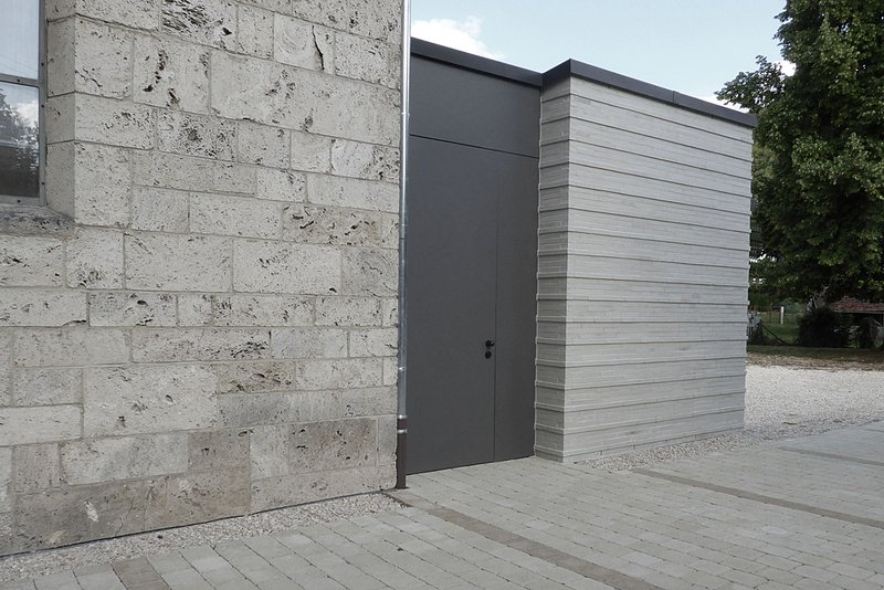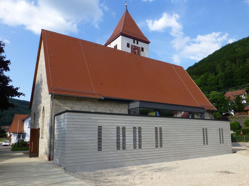 Von außen gesehen hält sich der schmale und langgestreckte Anbau zurück. Mit seiner hellen Klinkerfassade passt er sich dem Tuffsteinbau der gotischen Kirche an, ohne dessen Stilelemente zu kopieren. Durch eine dunkle Eternitfuge löst sich der Neubau mauerartig vom historischen Teil ab. Die Bänderung der Klinkerfassade unterstützt die lebendige Oberfläche der nahezu geschlossenen Klinkerfassade.
