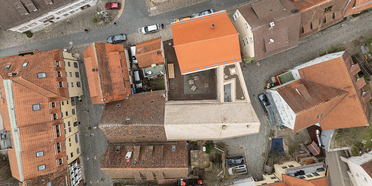 Die Planung sieht einen äußerst sensiblen Umgang mit der Bausubstanz und eine maximale Berücksichtigung der denkmalpflegerischen Belange vor. Im Bestandsgebäude kommt nach Sanierung des Fachwerks ein denkmalgerechtes Dämmputzsystem mit einem minimierten Aufbau von 4 cm zum Einsatz. Dies ermöglicht eine energetische Ertüchtigung bei gleichzeitig geringer Beeinträchtigung des historischen Erscheinungsbildes. Sämtliche Fensterrahmen können bei Einbau einer neuen Isolierverglasung, bzw. bei einem Einbau von Kastenfenstern im Bereich der historischen Fenster mit Bleisprossen erhalten werden. Die gesamte Raumstruktur und der historische Bestand des 15. bis 20. Jahrhunderts bleiben so weit als möglich sichtbar. Gleichzeitig wird die qualitätsvolle Ausstattung mit den historischen Oberflächen, Türen, Fenstern, Wandmalereien und Stuckprofilen authentisch bewahrt.