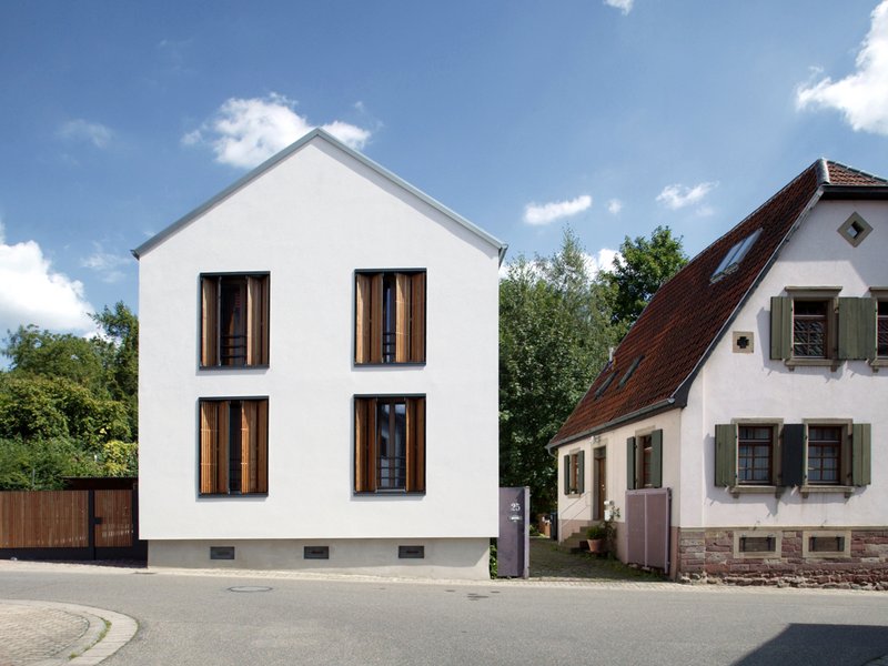 An der Straßenseite, an der das Gebäude direkt auf der Grenze und damit an der Straße steht, wurden als Sicht- und Sonnenschutz Faltschiebeläden mit senkrechten Lärcheleisten ausgeführt. Dadurch bleibt bei geschlossenen Läden der Kontakt zur Straße- nun gefiltert- mittelbar erhalten. Die Ansicht zur Straße, auf die man frontal zufährt oder -geht, gewinnt durch dieses Bauteil, das auch ein spielerisches Moment hat, an Markanz.